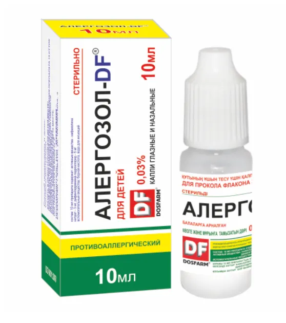 Алергозол-DF капли глазные и назальные предназначены для лечения аллергических заболеваний. Содержат 0,03% активного вещества в объеме 10 мл.