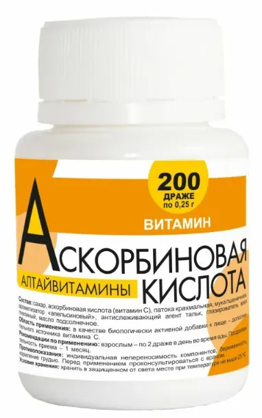 Аскорбиновая кислота (витамин С) в форме драже, 250 мг в одном драже, 200 штук в упаковке.