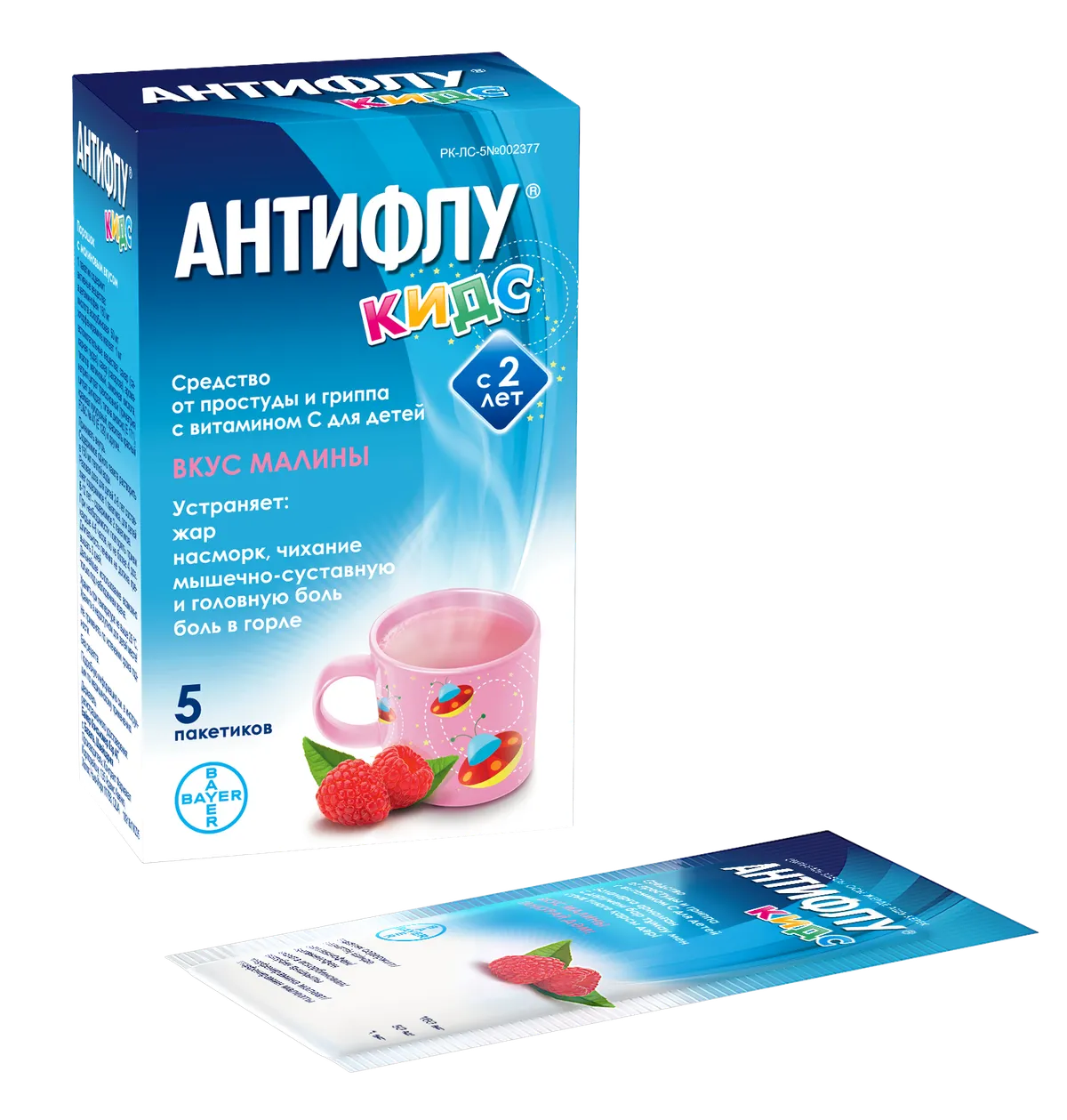 Антифлу Кидс - жаропонижающее средство в виде порошка для приготовления раствора с малиновым вкусом. Один пакетик содержит 160 мг ацетаминофена и 50 мг аскорбиновой кислоты.