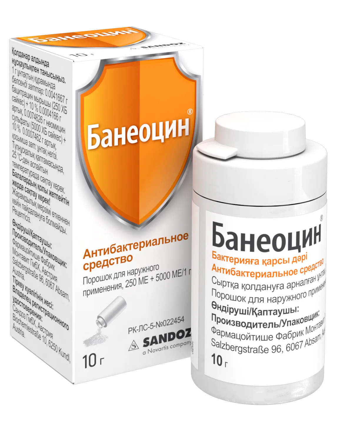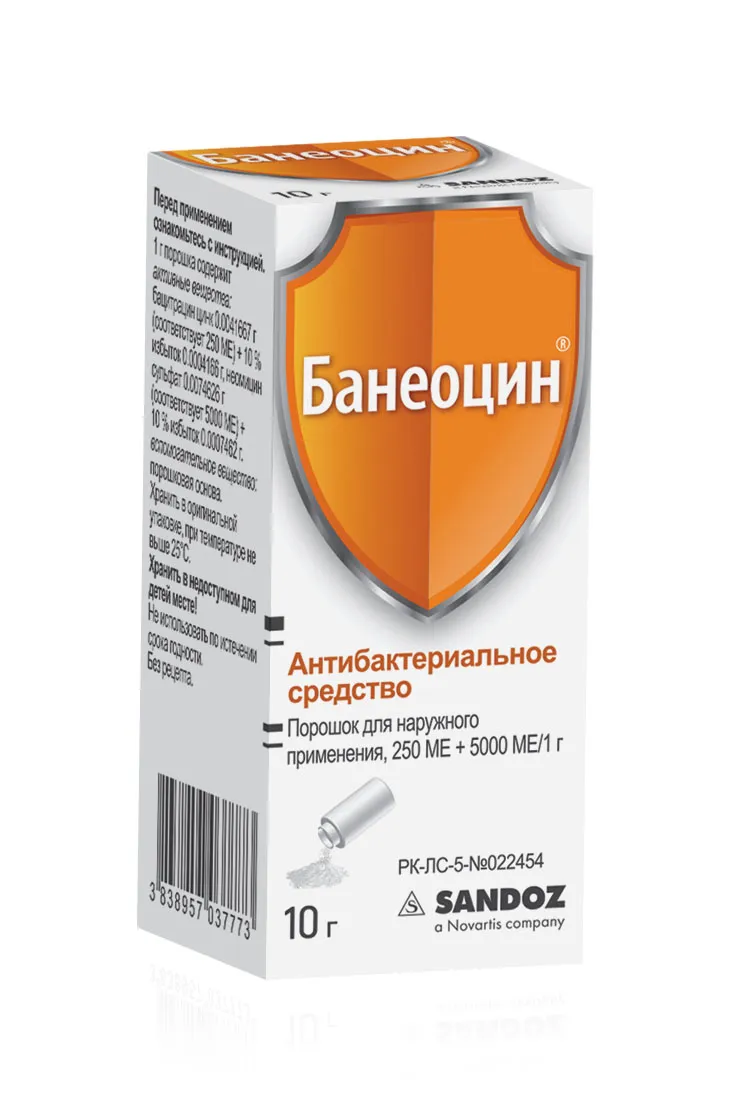 1 / 2Антисептический порошок для наружного применения, содержащий бацитрацин и неомицин, предназначен для лечения инфекций кожи.