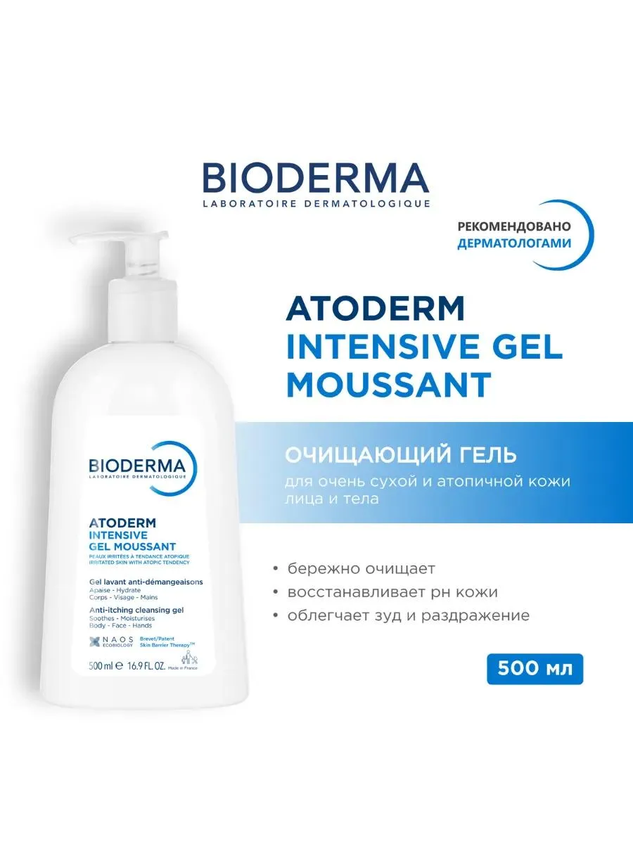 1 / 4Смягчающий, липидовосстанавливающий очищающий мусс для очень сухой, атопичной, чувствительной кожи. Очищающие компонеты и витамин РР в составе Атодерм мусса борются с размножением микроорганизмов и раздражающих агентов, усугубляющих сухость кожи.;Атодерм мусс Интенсив устраняет чувство дискомфорта и раздражения и способствует восстановлению кожного барьера.Гель можно использовать для очищения кожи тела, лица и рук. Утром и / или вечером. Нанести на влажную кожу, вспенить и тщательно смыть водой.