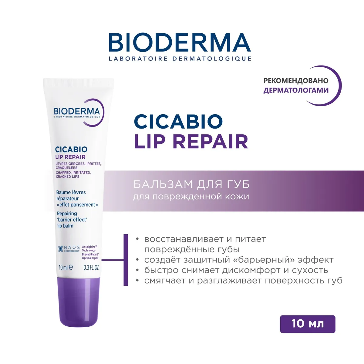 Восстанавливающий бальзам для очень сухих губ. Устранение дискомфорта и ускорение восстановления кожи благодаря активным компонентам.