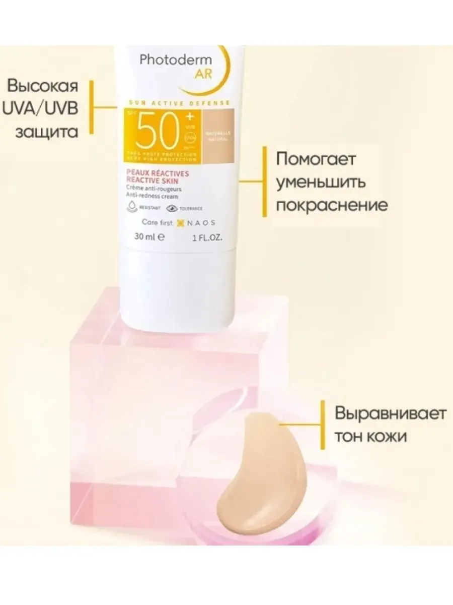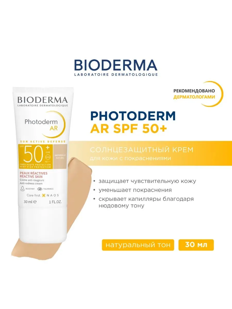 1 / 5Bioderma Photoderm AR SPF 50+ Tinted cream (Биодерма Фотодерм AR Крем тонирующий SPF 50+) для чувствительной кожи с покраснениями и розацеа.Солнцезащитный крем Bioderma Photoderm AR с фактором защиты от UVA / UVB излучений 50+. Защищает клетки от повреждения и предотвращает процессы преждевременного старения. Идеально подходит чувствительной коже, легко распределяется и не оставляет жирной пленки. Хорошо переносится кожей, не раздражает. Универсальный легкий тон маскирует покраснения и выравнивает цвет лица.Активные компоненты: Патент Rosactiv на биологическом уровне успокаивает кожу и уменьшает покраснения; Патент BioProtectionзащищает клетки кожи от воздействия ультрафиолета на биологическом уровне.фотостабильный.влагоустойчивый.без отдушек.некомедогенно.