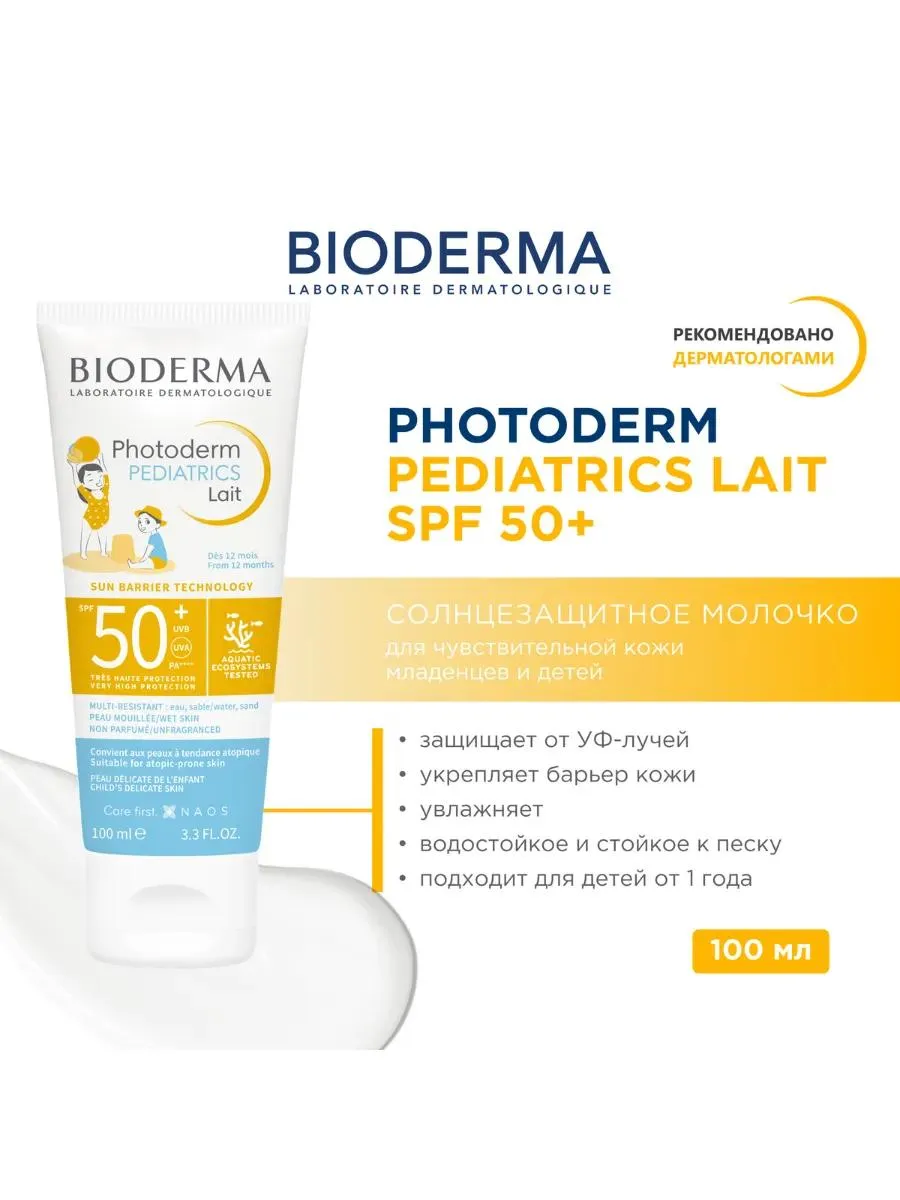 1 / 8Bioderma Photoderm Pediatrics Lait SPF50+ — это солнцезащитное средство широкого спектра действия с очень высокой степенью защиты для нежной детской кожи .Технология Sun Barrier сочетает в себе УФ-фильтры и витамин Е, антиоксидант, естественным образом присутствующий в коже, с маслом абрикосовых косточек, богатым биомиметическими липидами. Он обеспечивает двойную экобиологическую защиту, адаптированную к нежной коже детей:- Очень высокая защита широкого спектра UVA/UVB.- Защита и укрепление кожного барьера, что также предотвращает долгосрочное повреждение.Эта короткая формула основана на четырех высокоэффективных, безопасных и экологически чистых фильтрах.Его легкая, быстро впитывающаяся текстура делает кожу мягкой и комфортной, обеспечивая невидимый и нелипкий финиш.Протестировано под педиатрическим, дерматологическим и офтальмологическим контролем. Подходит для кожи с атопической тенденцией.Очень хорошая переносимость.Фотографии таблицы. Мультистойкий (вода, песок), подходит для влажной кожи.Непарфюмированный.