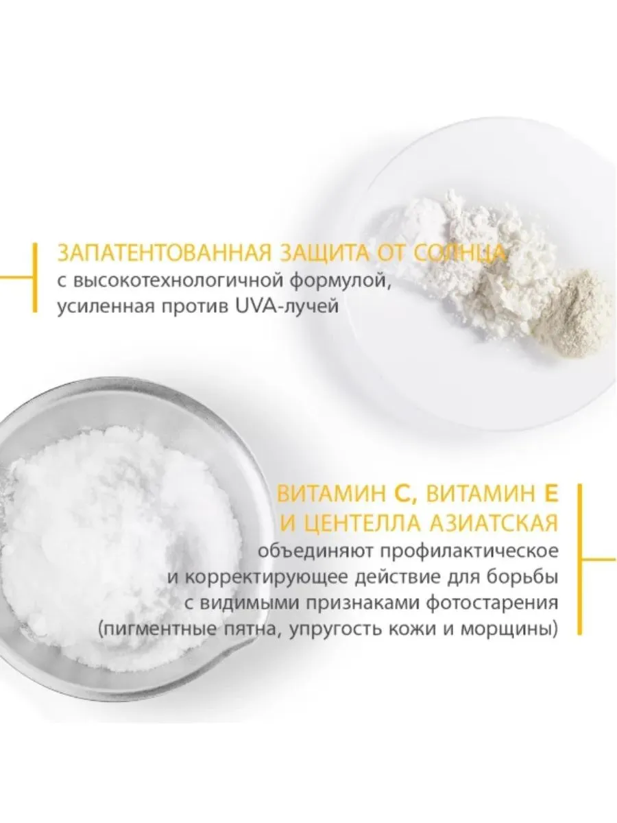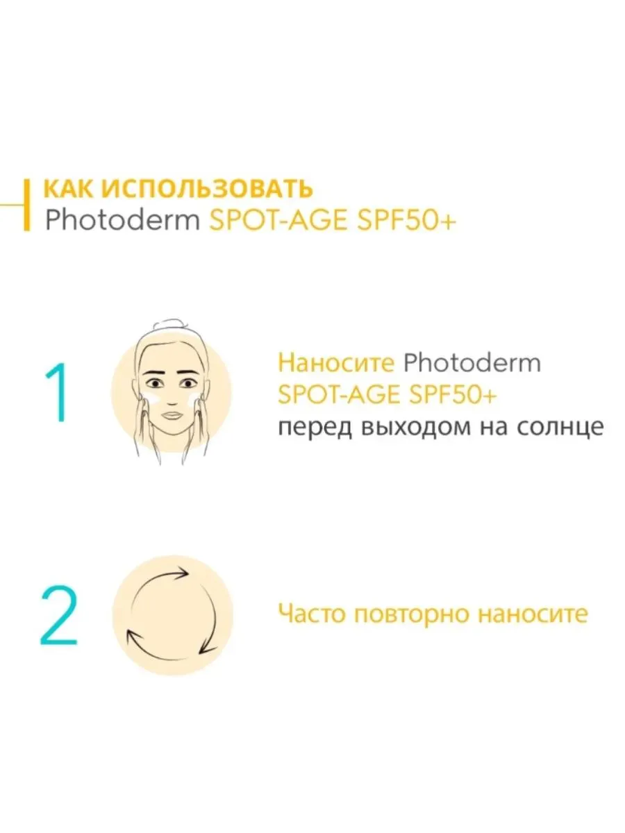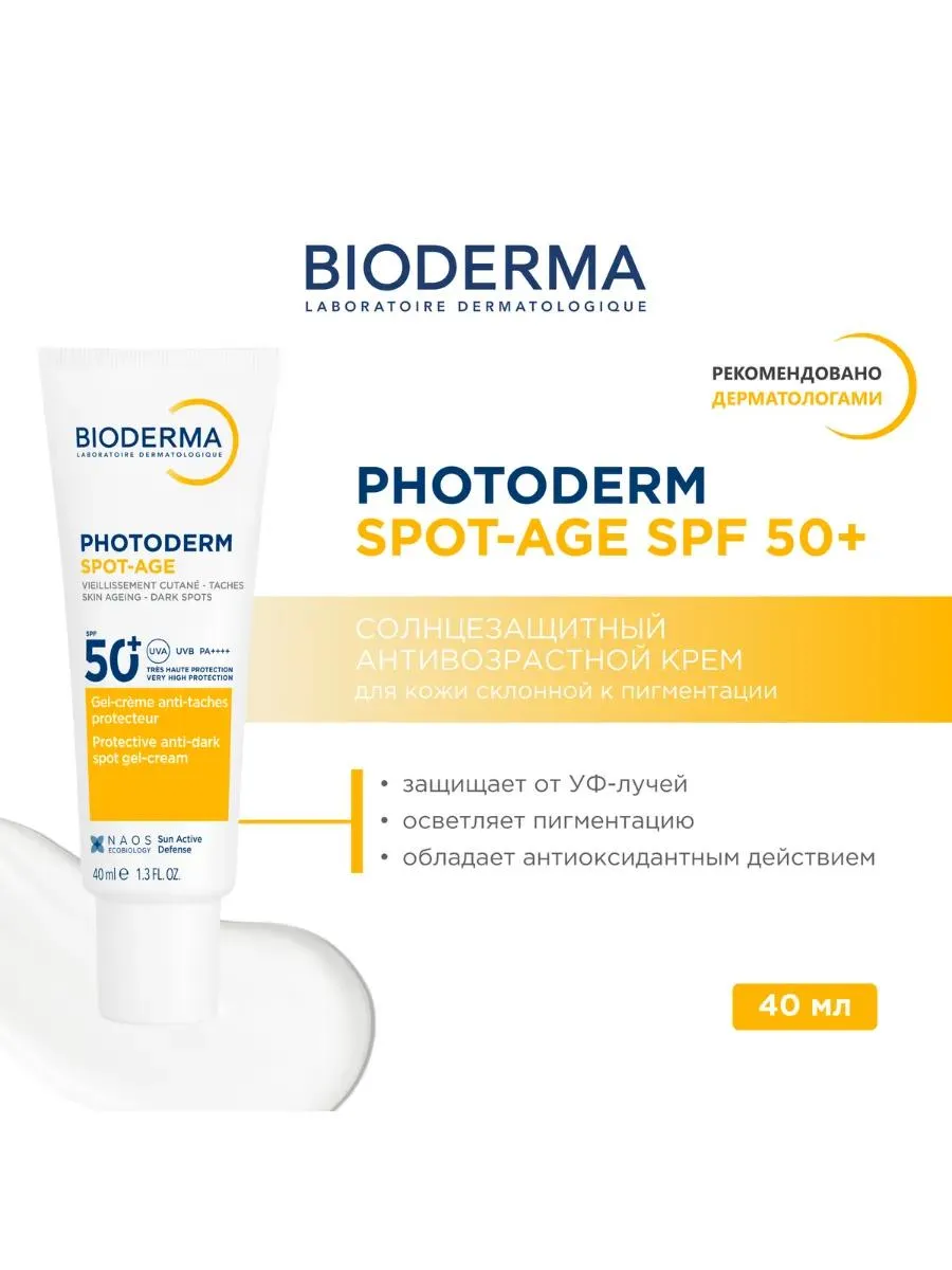 Для эффективной защиты кожи от УФ-излучения и борьбы с гиперпигментацией используйте Bioderma Photoderm Spot-Age SPF 50+. Средство специально разработано для предотвращения фотостарения кожи, антиоксидантной защиты клеток, устранения существующих и предотвращения появления новых пигментных пятен и морщин. Продукт объединяет силу трех активных ингредиентов, признанных дерматологами: витаминов С и Е, а также центеллы азиатской. Вместе с фильтрами широкого спектра защиты (УФ, видимый и инфракрасный свет) они представляют собой идеальный уход для кожи во время пребывания на солнце, предотвращают потерю упругости, морщины и пигментные пятна. Витамины С и Е обеспечивают антиоксидантную защиту всех элементов клетки, поскольку один из них является липофильным, а другой – гидрофильным. Благодаря сочетанию с глюкозой высвобождение витамина С регулируется в зависимости от потребностей эпидермиса. Крем против пигментации и морщин Биодерма Фотодерм SPF50+ обладает легкой, сухой на ощупь текстурой, хорошо переносится даже кожей области глаз, устойчив к воздействию влаги и высокой температуры, обеспечивает стойкость SPF в течение 8 часов. Может использоваться как основа под макияж. Подходит для кожи после поверхностной обработки лазером.Bioderma Photoderm Spot-Age SPF 50+ прошел дерматологические испытания, в ходе которых доказано:после 28 дней использования средняя глубина морщин снижается на 15%;после 56 дней использования пигментные пятна стали менее выраженнымиу 97% испытуемых после 28 дней использования уменьшилось появление новых пигментных пятен;<после 28 и 56 дней использования значительно повысилась однородность кожи, она стала более сияющей;у 79% испытуемых заметна коррекция признаков старения через 28 дней использования;кожа более упругая через 28 дней - 86,4% через 56 дней – 100%.Активные компоненты:запатентованный комплекс Cellular Bioprotection мобилизует естественную защиту эпидермиса от солнечных лучей;аскорбил глюкозид – стабильная форма витамина С, которая превращается в аскорбиновую кислоту при взаимодействии с кожей - проявляет антиоксидантные свойства, защищает от солнца, стимулирует выработку коллагена;альфа-токоферол – витамин Е в активной форме, защищает мембраны клеток от повреждения свободными радикалами, предотвращает фотостарение кожи;центелла азиатская укрепляет внеклеточный матрикс путем стимулирования синтеза коллагена первого типа в дерме, восстанавливает кожу.водостойкий.фотостабильный.некомедогенно