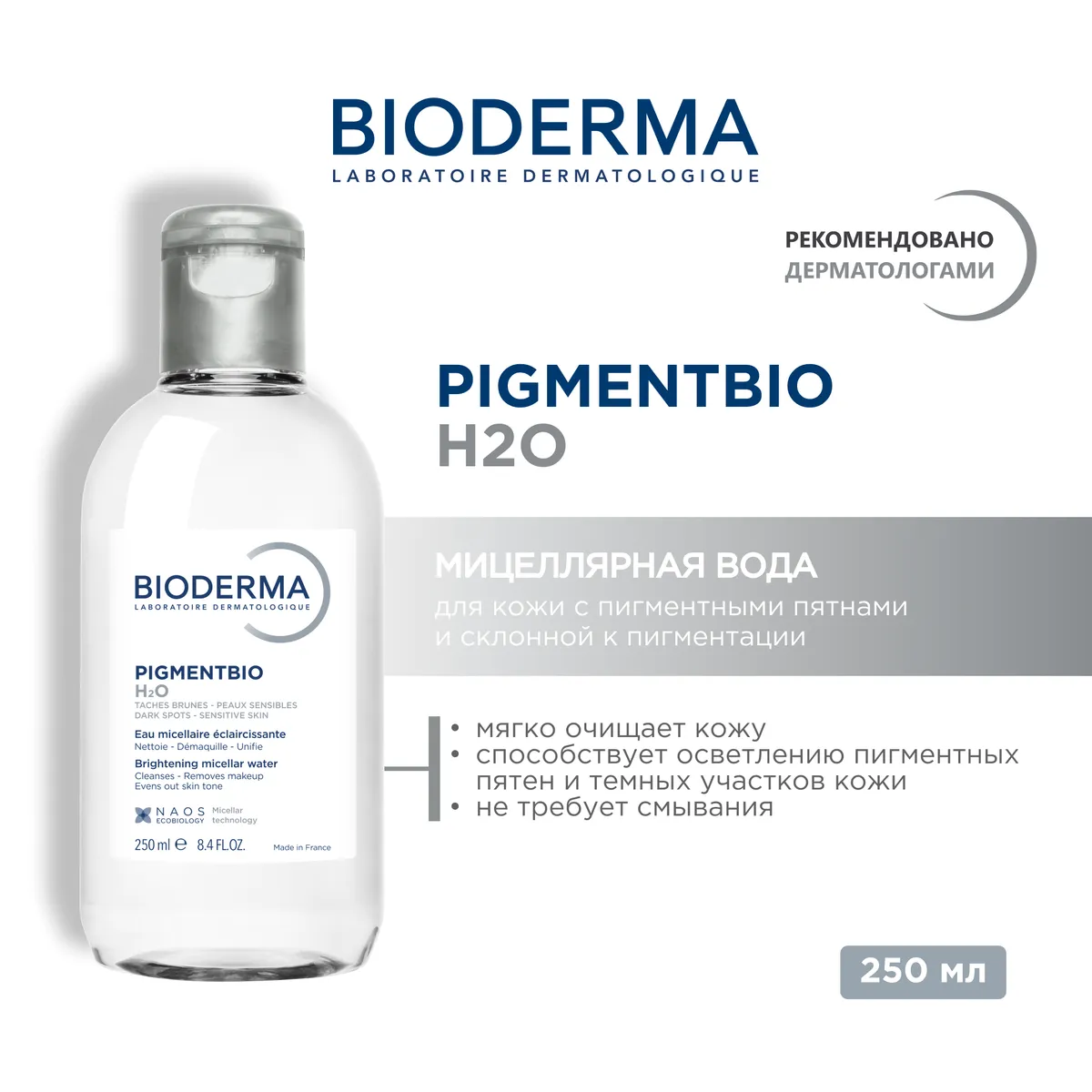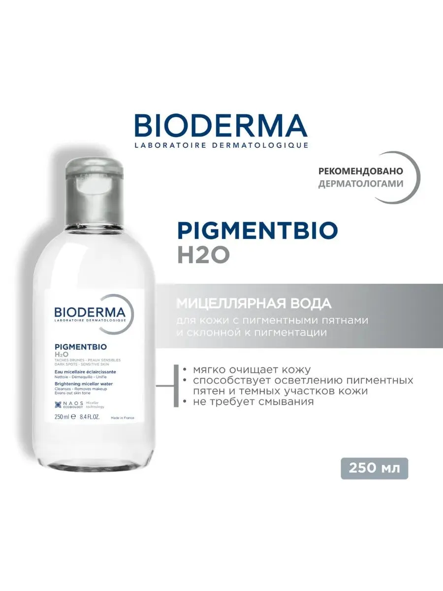 1 / 8Bioderma Pigmentbio H2O предназначена для деликатного очищения и демакияжа кожи лица и контура глаз с проблемами гиперпигментации. Запатентованная комбинация активных ингредиентов в составе Биодерма Пигментбио Н2О Мицеллярной воды дарит сияние и выравнивает тон кожи. Опрос после клинических испытаний (31 доброволец в возрасте от 20 до 50 лет в течение 28 дней) показал, что 90% участников отметили великолепные очищающие и осветляющие свойства Pigmentbio H2O уже после первого применения. Средство прошло дерматологический контроль.