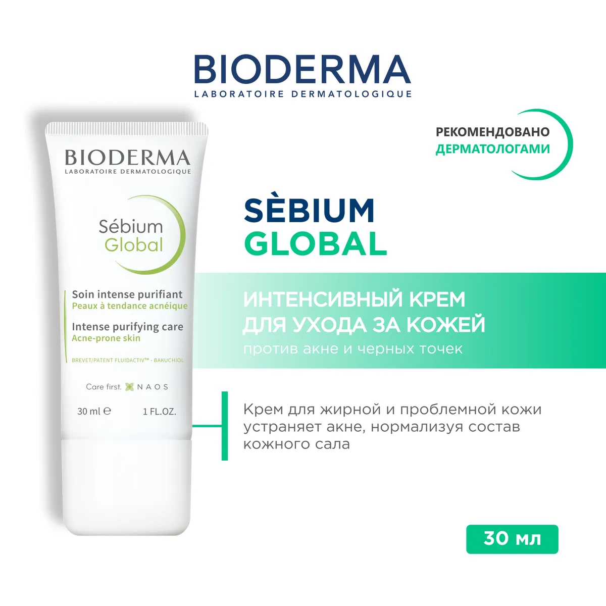 1 / 2Bioderma Sebium Global intensive purifying care – это уникальное средство, которое устраняет причины развития воспалительных элементов и акне за счет нормализации состава кожного сала.
