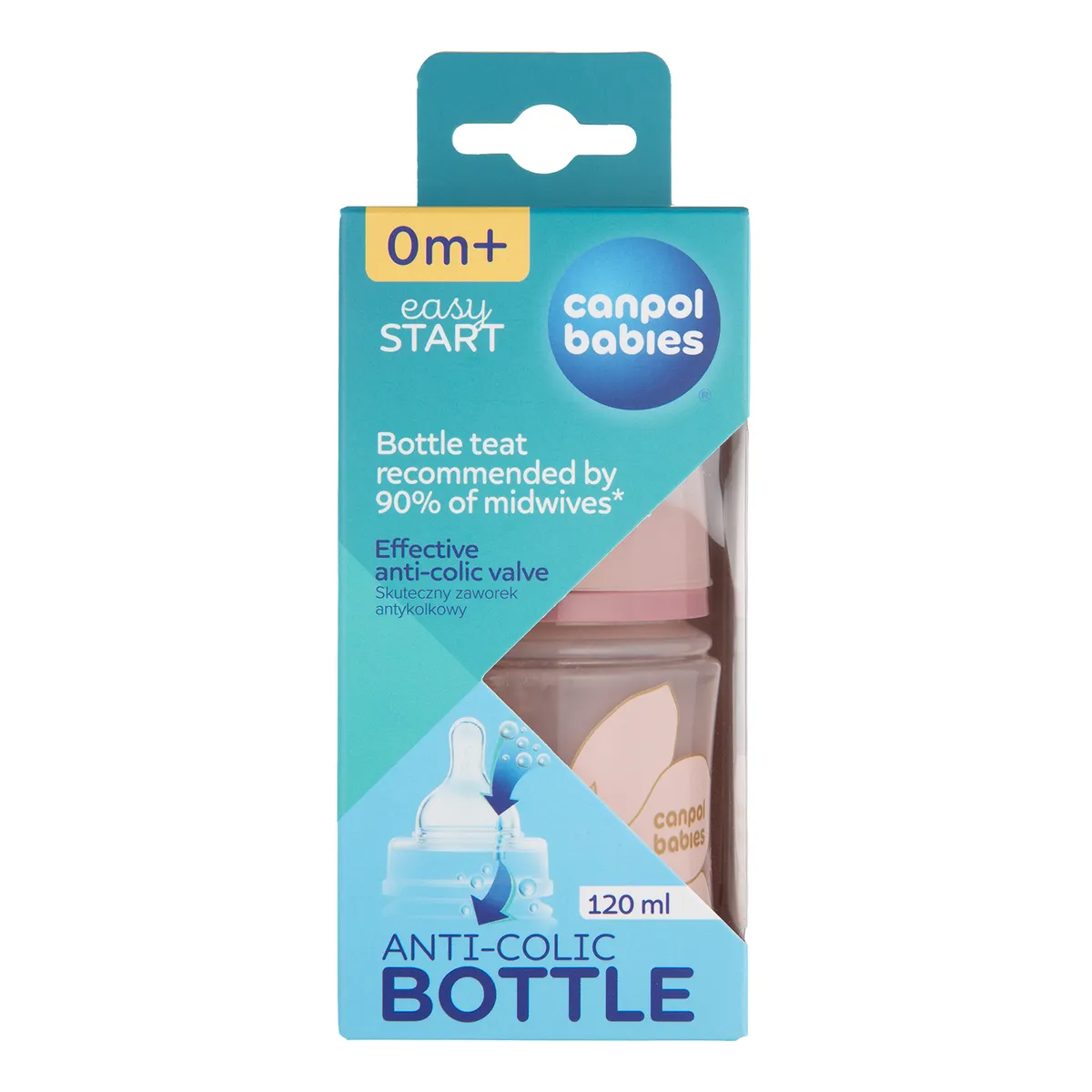 1 / 4Бутылочка Canpol EasyStart GOLD антиколиковая с широким горлышком объемом 120 мл. Специальный антиколиковый клапан предотвращает накопление пузырьков воздуха в пище, что помогает устранить дискомфорт у малыша, связанный с коликами и метеоризмом.