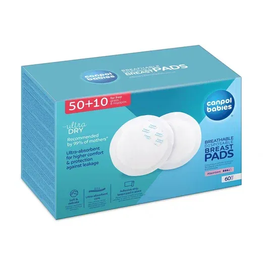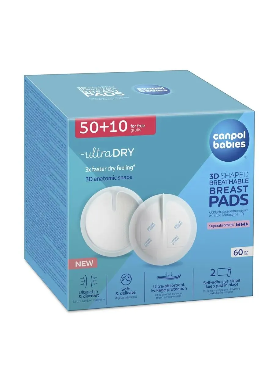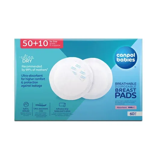 1 / 10Дышащие одноразовые вкладыши для груди Canpol Babies с мягкой внешней поверхностью, обеспечивающей комфорт и защиту нежной кожи. Специальная самоклеющаяся лента надежно фиксирует прокладки на белье. Каждая пара вкладышей упакована в индивидуальную упаковку.