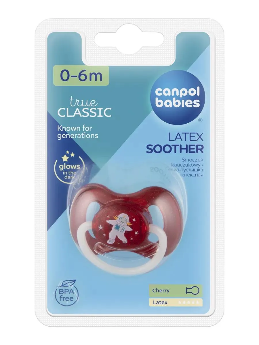 1 / 4Соска-пустышка Space от Canpol изготовлена из высококачественного латекса. Круглая форма вишни и специальный вентилируемый нагубник предотвращают натирание кожи ребенка. Подходит для детей от 0 до 6 месяцев. Не содержит BPA.