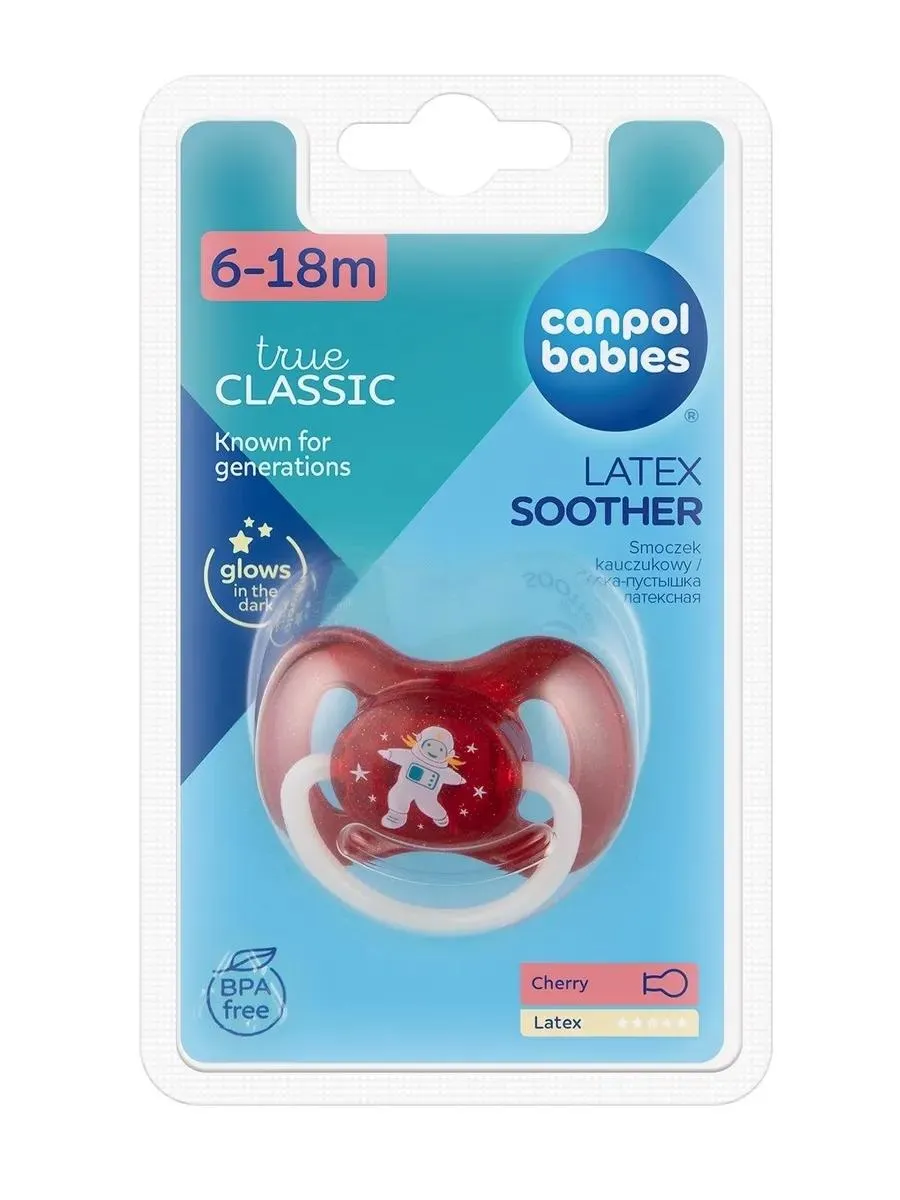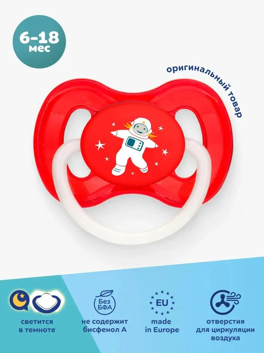 1 / 4Пустышка SPACE изготовлена из высококачественного латекса. Соска в форме вишни с вентилируемым нагубником, предотвращающим натирание кожи. Подходит для детей от 6 до 18 месяцев. Не содержит BPA.