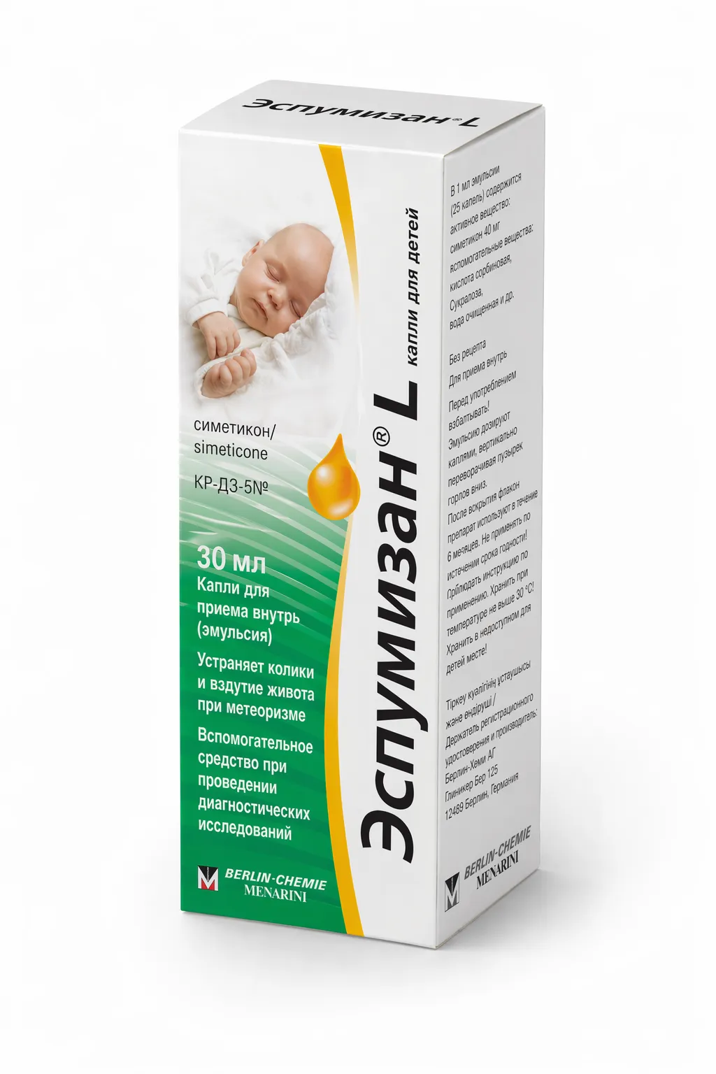Эспумизан L - капли для приема внутрь объемом 30 мл, содержащие симетикон 40 мг. Применяются для облегчения симптомов газообразования у детей.