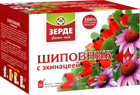 Фито-чай с плодами шиповника и травой эхинацеи. Состав: плоды шиповника, трава эхинацеи, листья мяты, каркаде, трава мелиссы и другие компоненты.