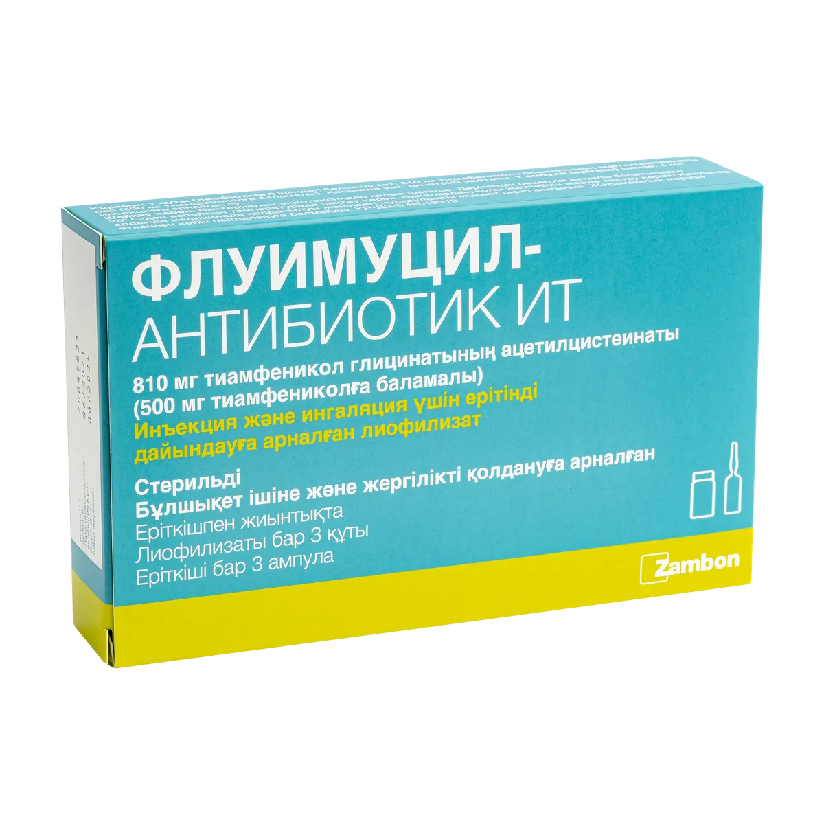 Флуимуцил-антибиотик ИТ в форме лиофилизата для приготовления раствора для инъекций и ингаляций. Содержит 500 мг активного вещества в каждой упаковке, включает растворитель. Упаковка содержит 3 штуки.