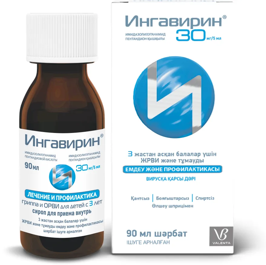 Ингавирин — противовирусный препарат в форме сиропа, содержащий 30 мг активного вещества на 5 мл. Упаковка 90 мл.