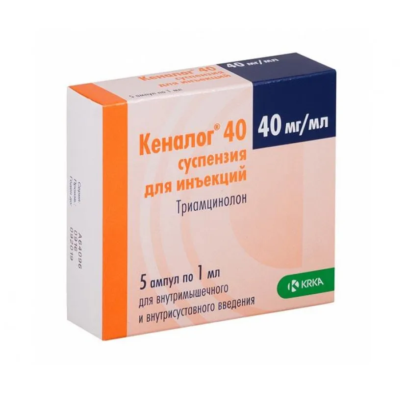 Кеналог — суспензия для инъекций с активным веществом триамцинолона ацетонид, 40 мг/мл. Упаковка содержит 5 ампул по 1 мл.