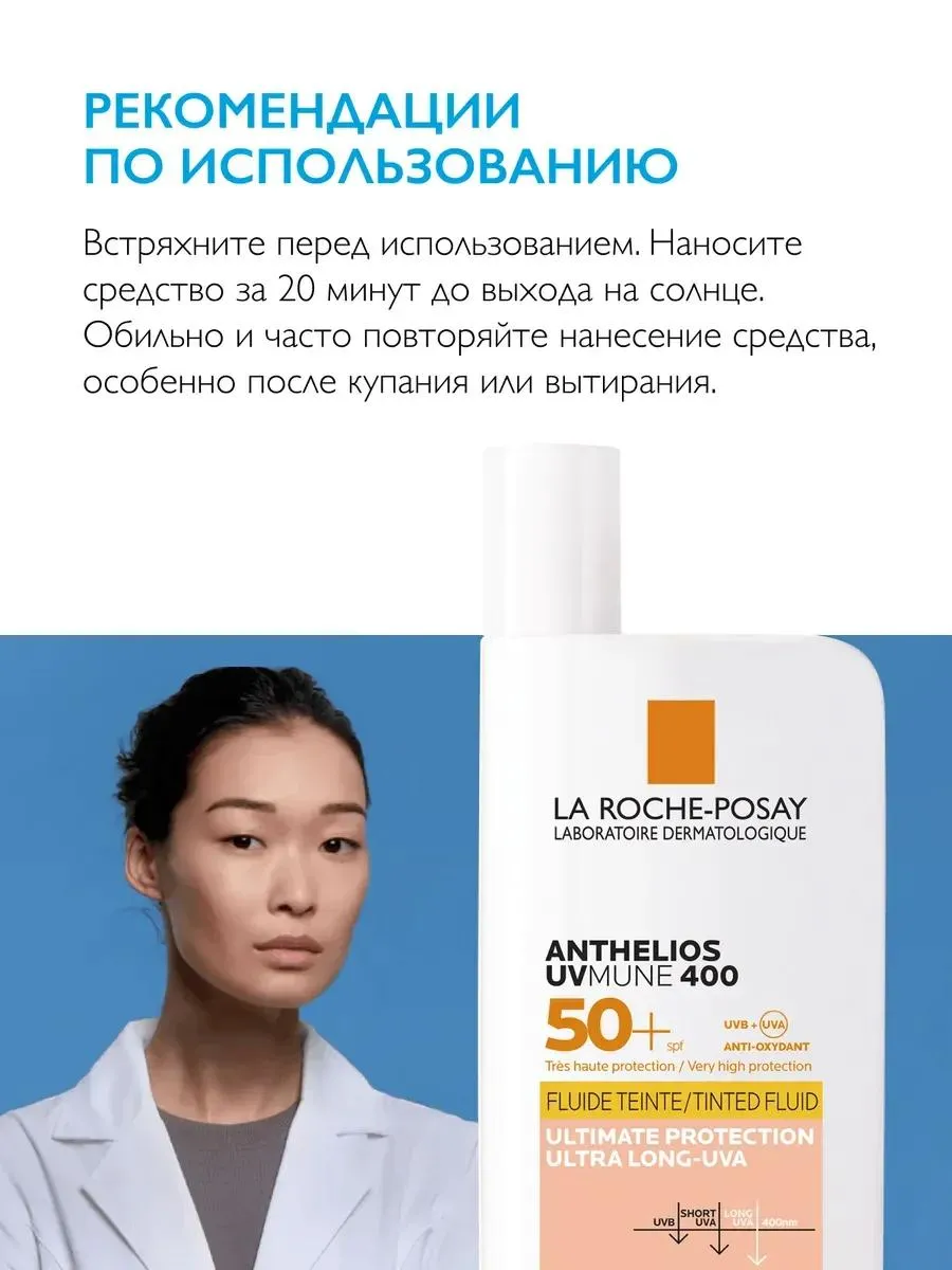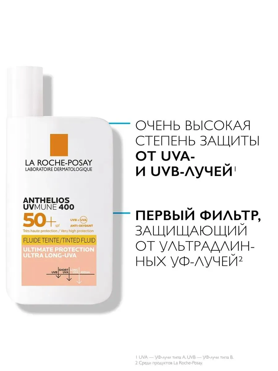 1 / 10Флюид тонирующий солнцезащитный с высокой степенью защиты SPF50+ для всех типов кожи. Инновационный фильтр Mexoryl 400 защищает от ультрадлинных UVA-лучей.