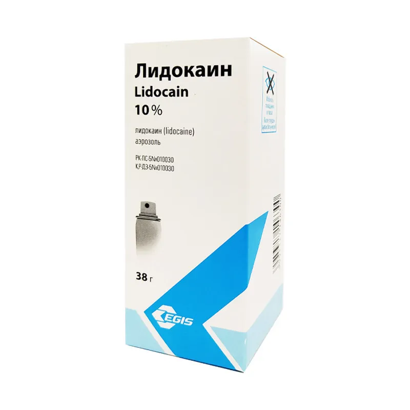 Лидокаин в форме аэрозоля 10% для местного применения, объем 38 г. Обладает анестезирующим эффектом.