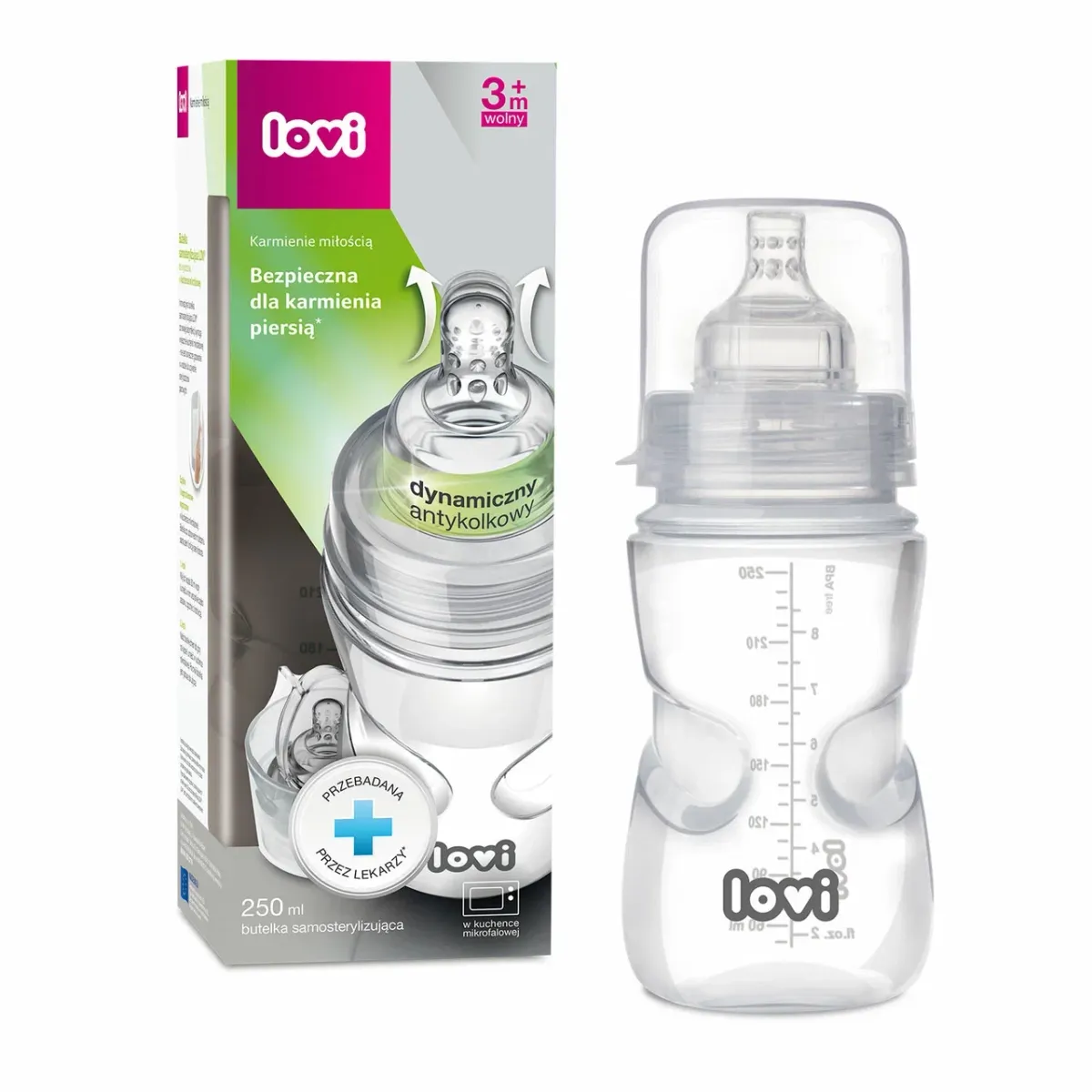 1 / 6Антиколиковая бутылочка для кормления Lovi с динамической соской, созданная специально для малышей. Гарантия легкого начала грудного вскармливания; позволяет сочетать грудное вскармливание и кормление из бутылочки. Оснащена уникальной динамической соской из тонкого силикона с жестким профилированным основанием и системой отвода воздуха Super Vent.