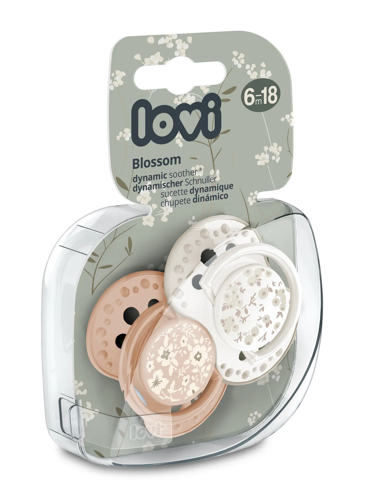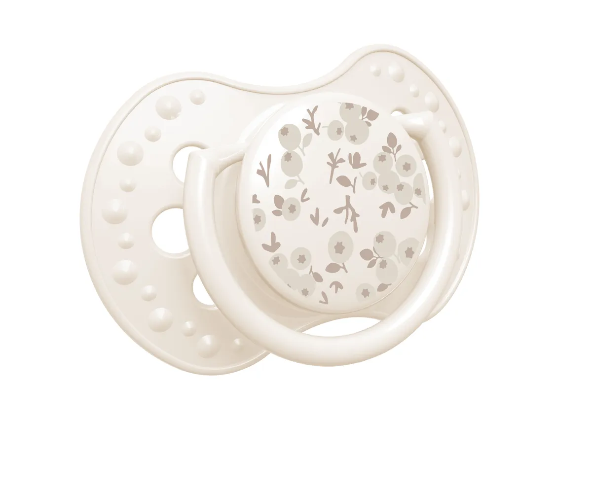 1 / 4Соска-пустышка силиконовая динамическая №2 BLOSSOM IVORY для девочки, возраст 6-18 месяцев. Обеспечивает комфорт при сосательных движениях благодаря симметричной форме и гетерогенному силиконовому слою.