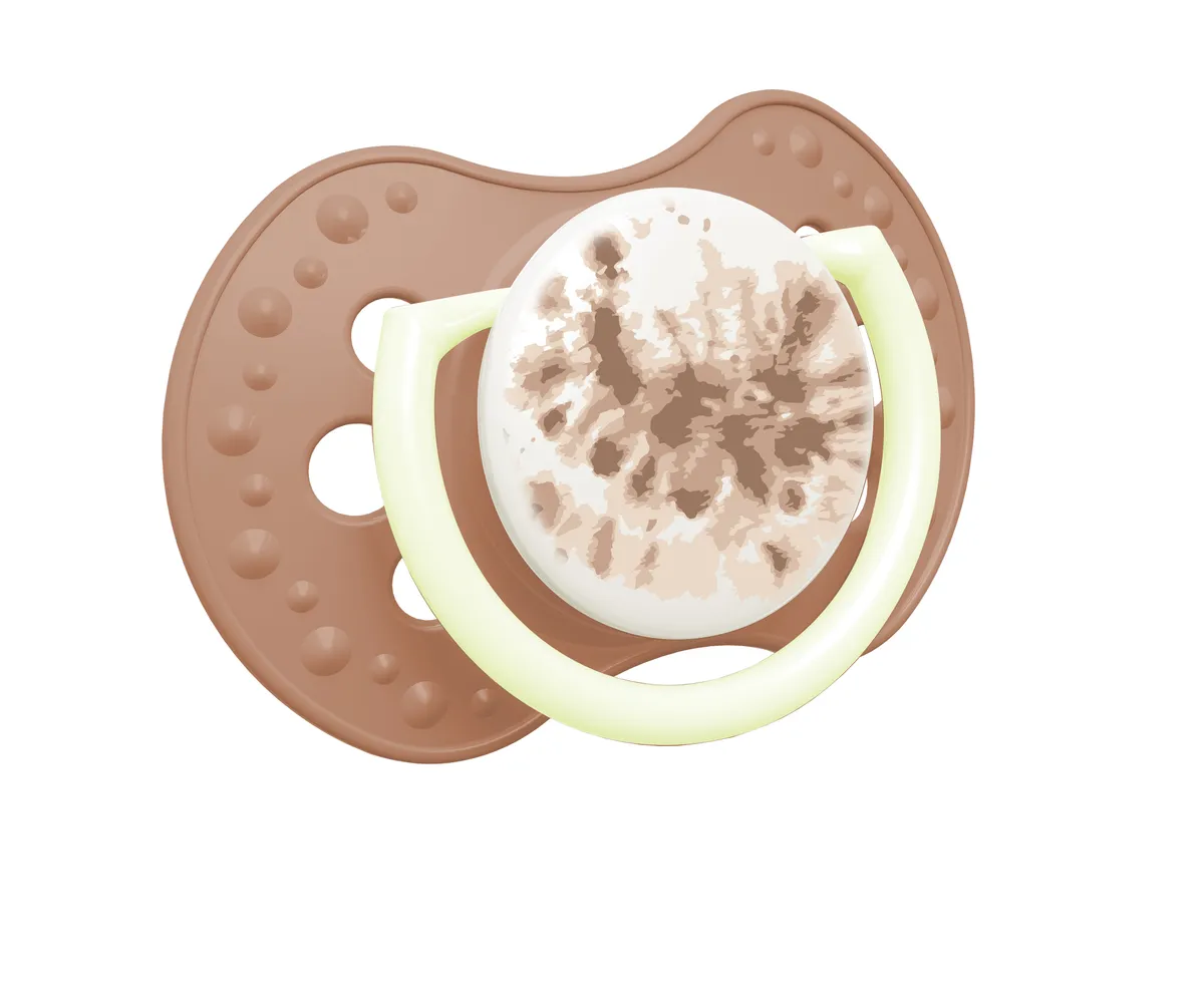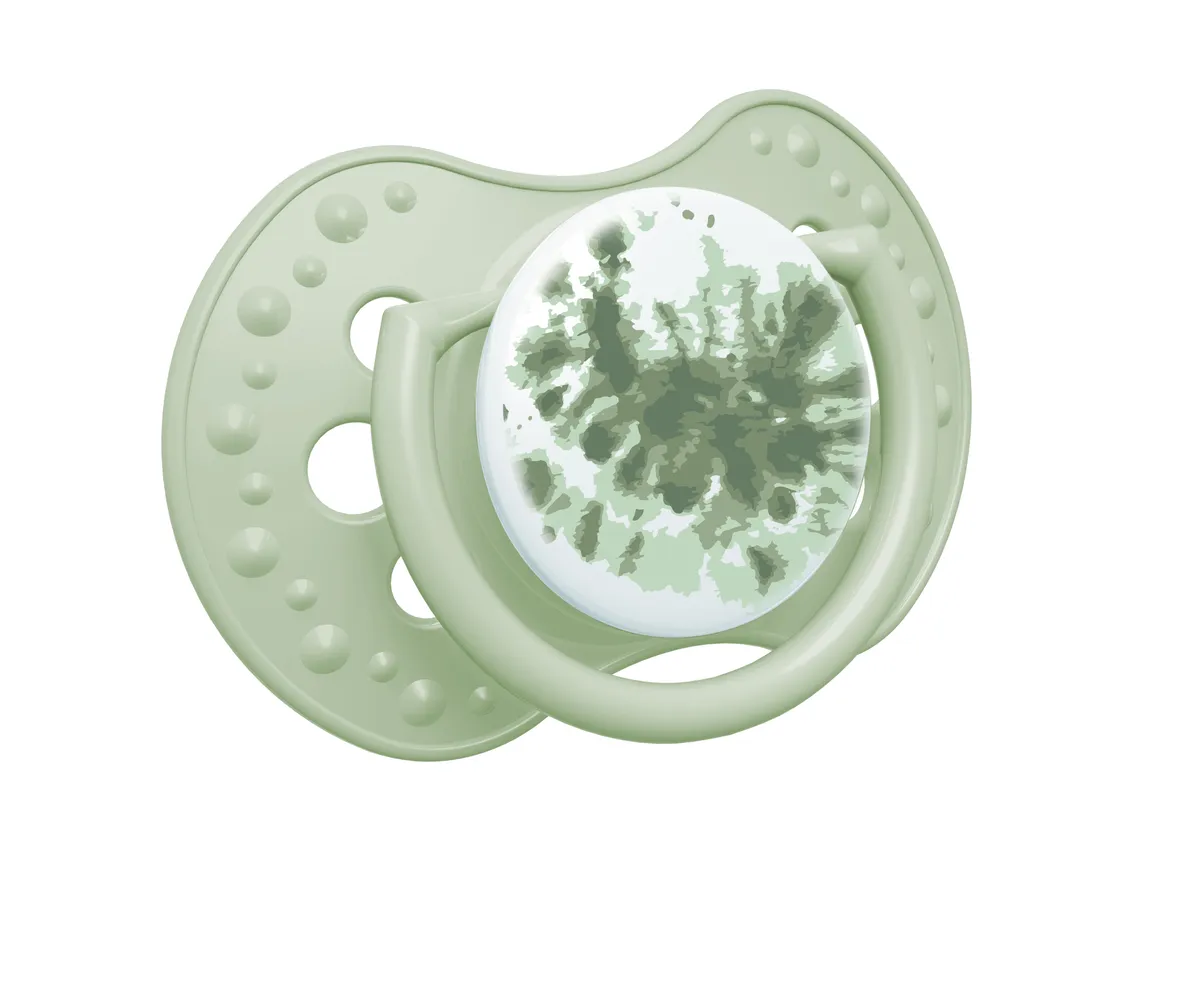 1 / 4Соска-пустышка силиконовая динамическая №2 TIE DYE для девочки, подходит для детей от 0 до 3 месяцев. Обеспечивает комфортное сосание благодаря симметричной форме и гетерогенному силиконовому слою.