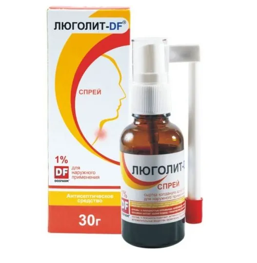 Люголит-DF - спрей для наружного применения с активным веществом йод, предназначенный для лечения заболеваний горла. Объем: 30 г.