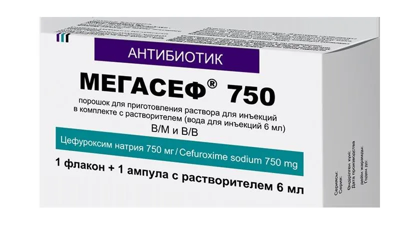Мегасеф - антибиотик на основе цефуроксима. Порошок для приготовления раствора для внутривенных и внутримышечных инъекций, в комплекте с водой для инъекций объёмом 6 мл.