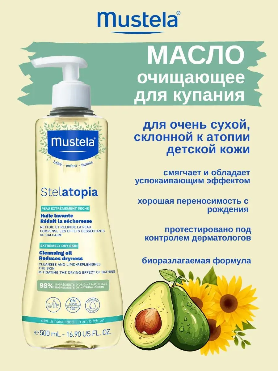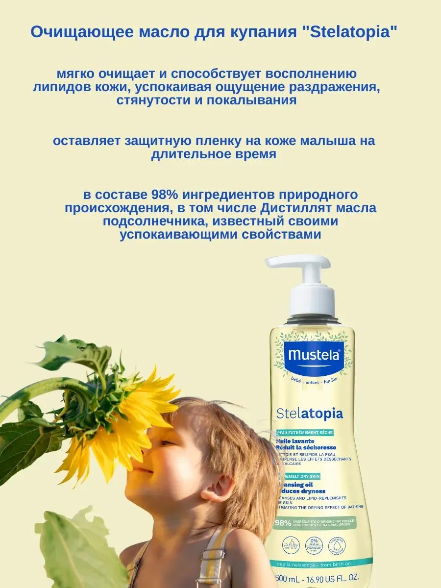 1 / 4Масло очищающее для купания Stelatopia рекомендовано для детей с рождения, подходит для очень сухой, склонной к атопии кожи. Мягко очищает и восстанавливает липиды кожи, предотвращая раздражение во время купания.