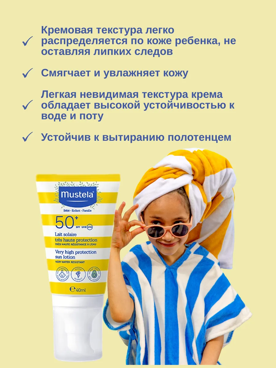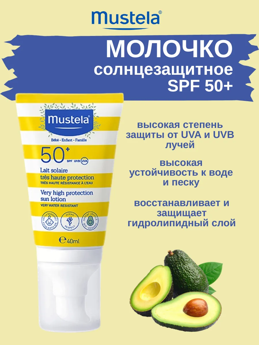 1 / 5Солнцезащитное молочко Mustela SPF 50+ обеспечивает максимальную защиту от UVA и UVB-лучей. Устойчиво к воздействию солнца, воды и песка, подходит для всех типов кожи, включая чувствительную и детскую. Объем 40 мл.