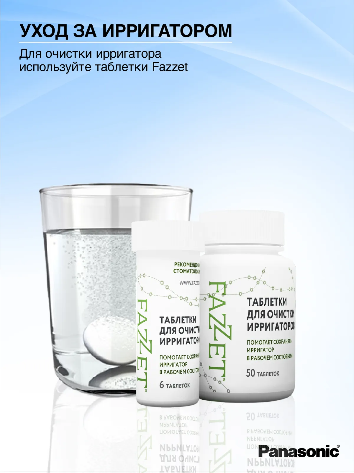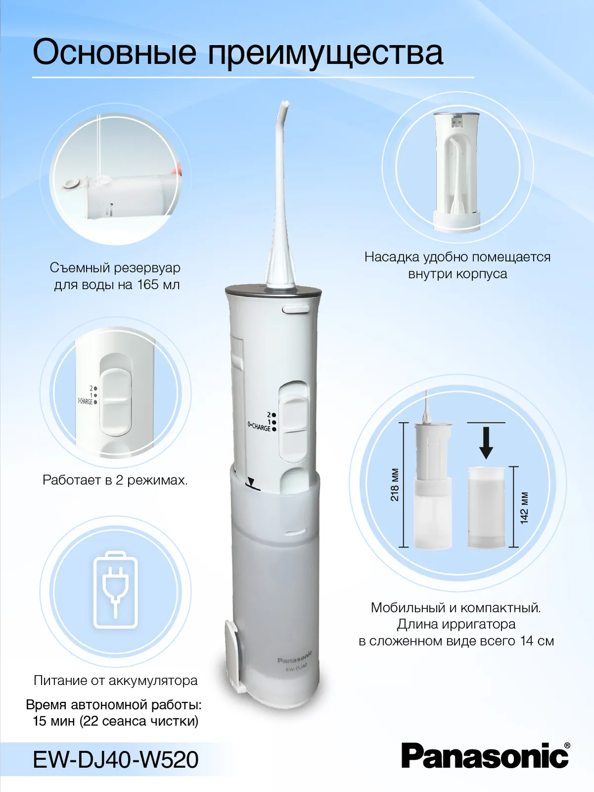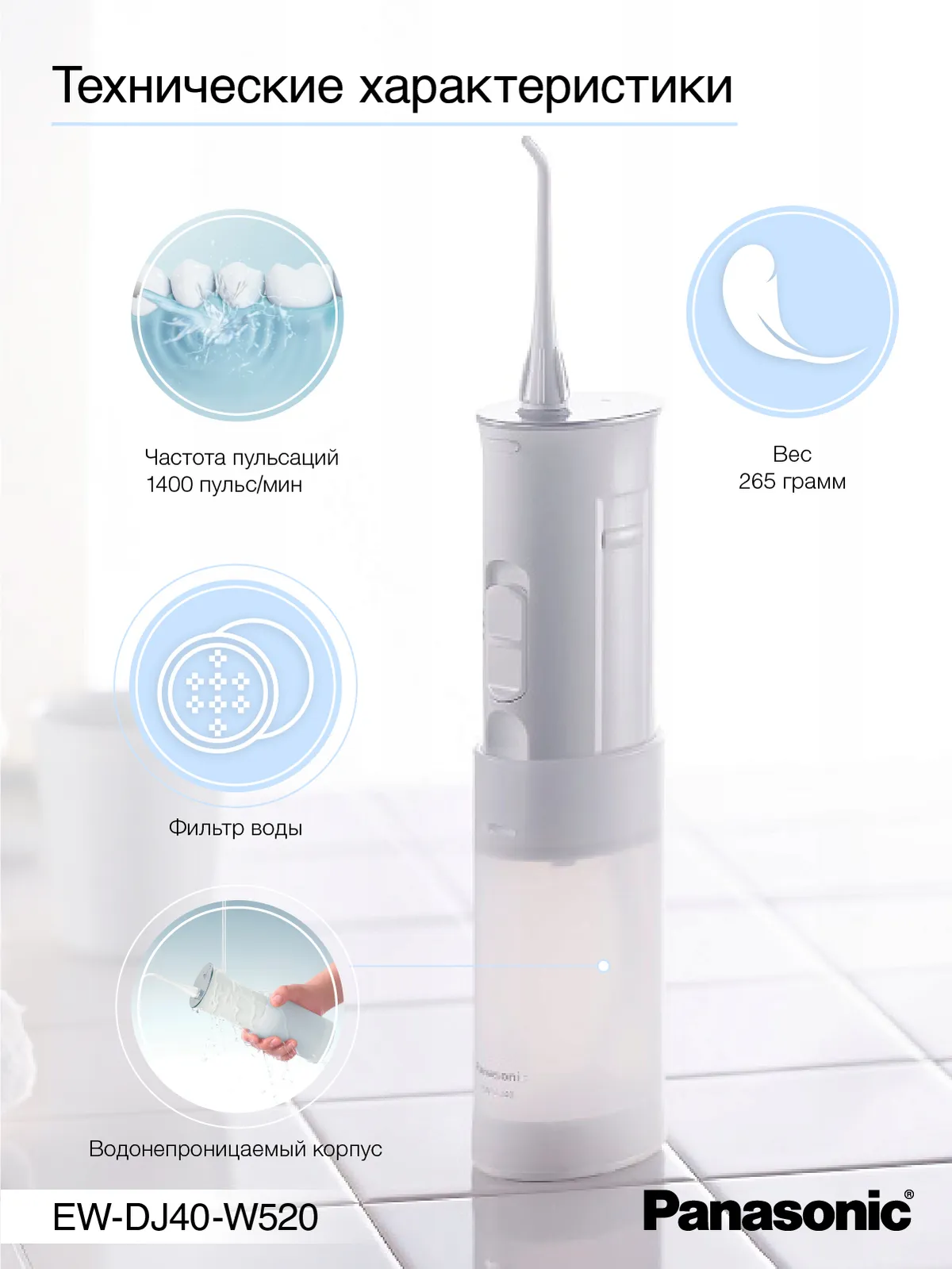 1 / 10Портативный ирригатор полости рта Panasonic EW-DJ40-W520 с различными режимами подачи воды для индивидуальной чистки. Компактный и удобный, идеально подходит для использования дома и в дороге.