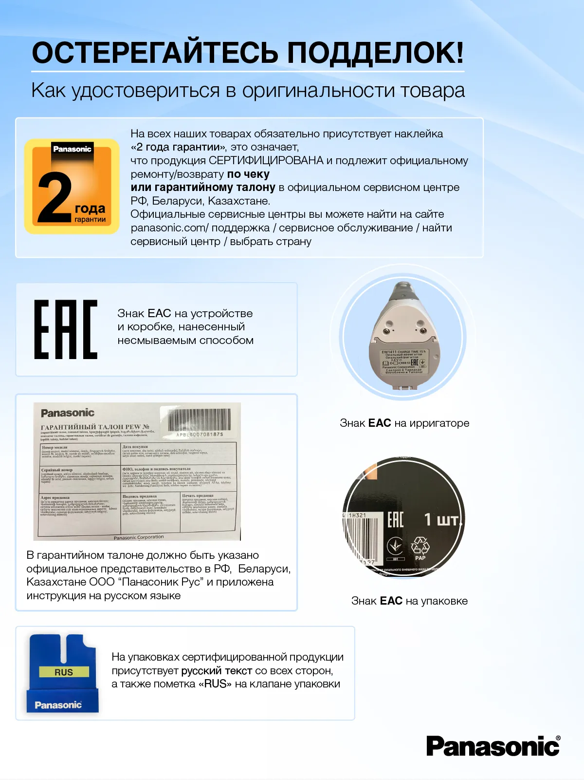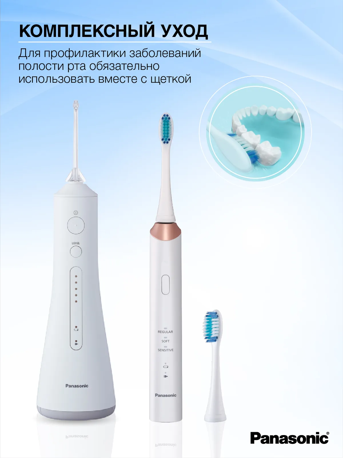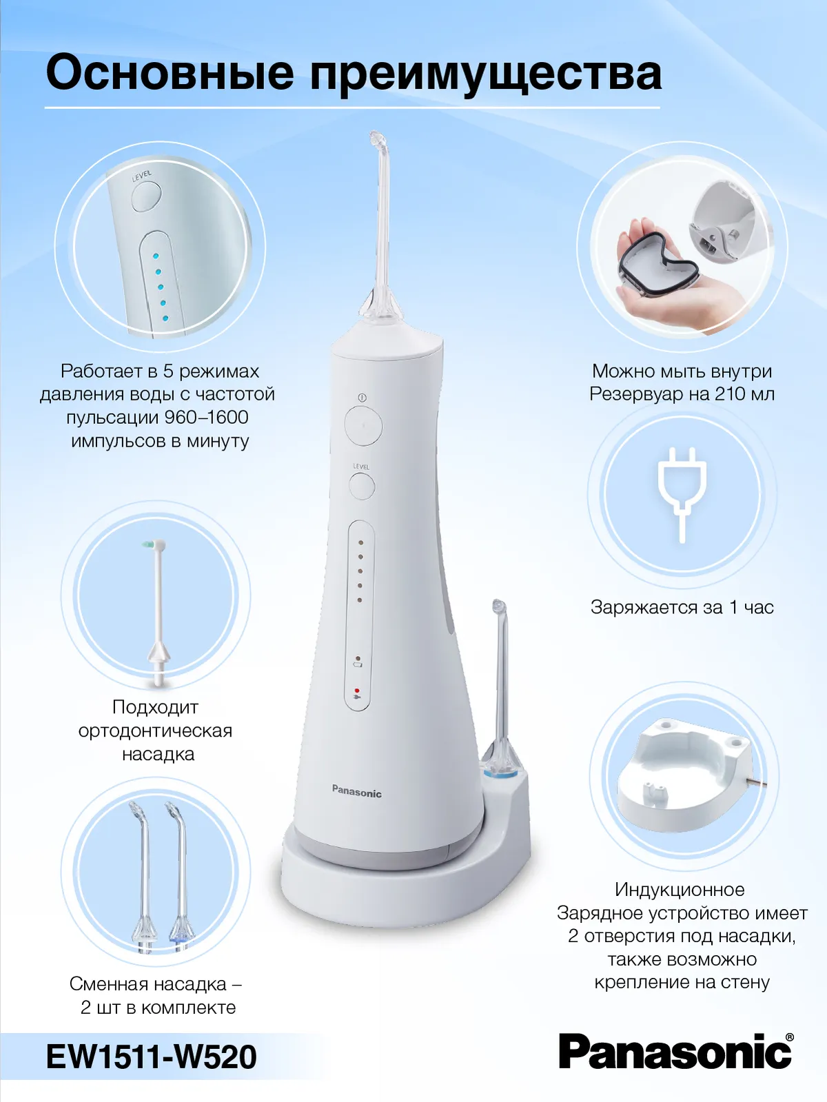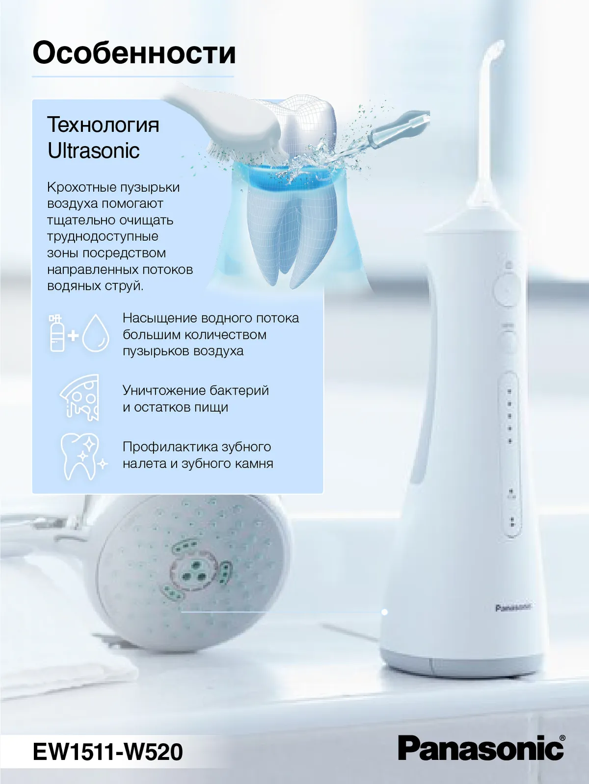 1 / 10Ирригатор Panasonic EW1511W520 обеспечивает эффективную гигиену полости рта благодаря мощной струе воды и технологии ультразвуковой чистки, удаляя остатки пищи и налет из труднодоступных мест.