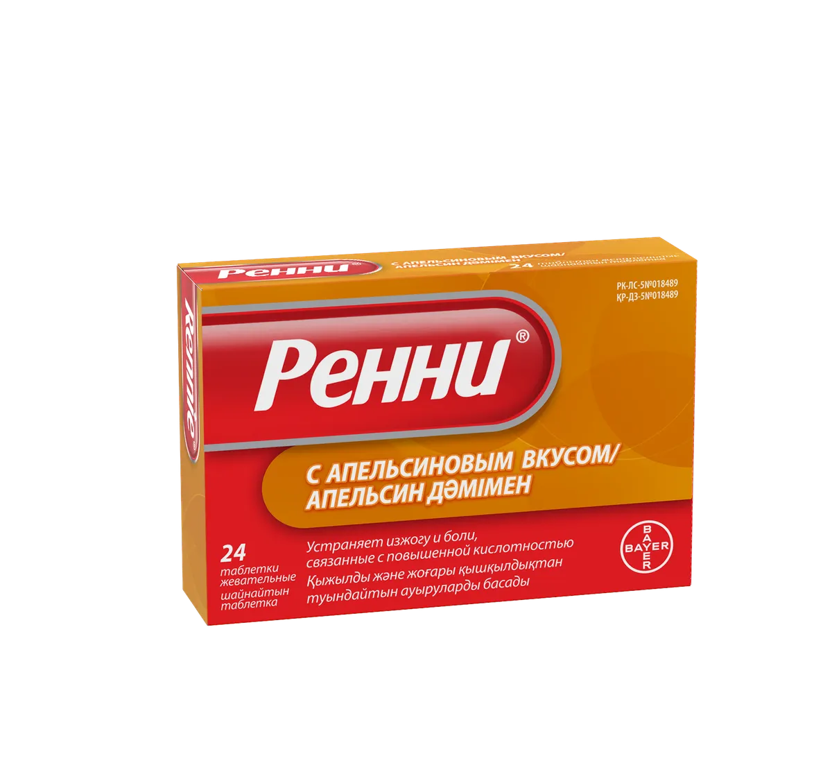Ренни - жевательные таблетки для облегчения изжоги, содержащие 680 мг кальция карбоната и 80 мг магния карбоната. Упаковка содержит 24 таблетки с апельсиновым вкусом.