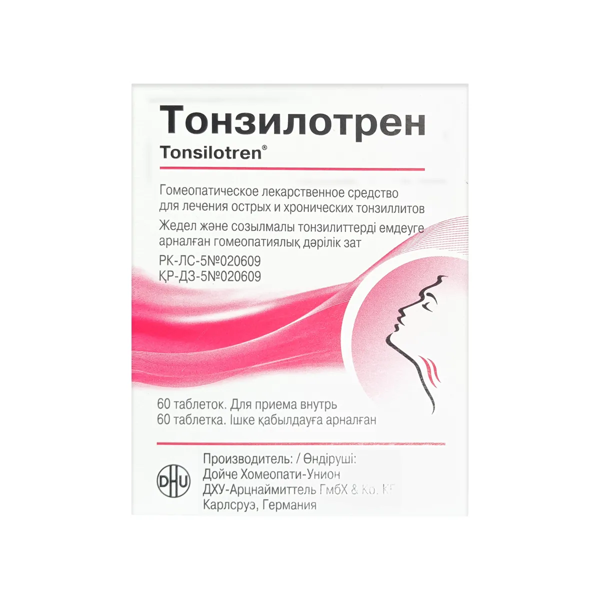 Гомеопатическое средство Тонзилотрен в форме таблеток для поддержания здоровья горла. Упаковка содержит 60 таблеток.