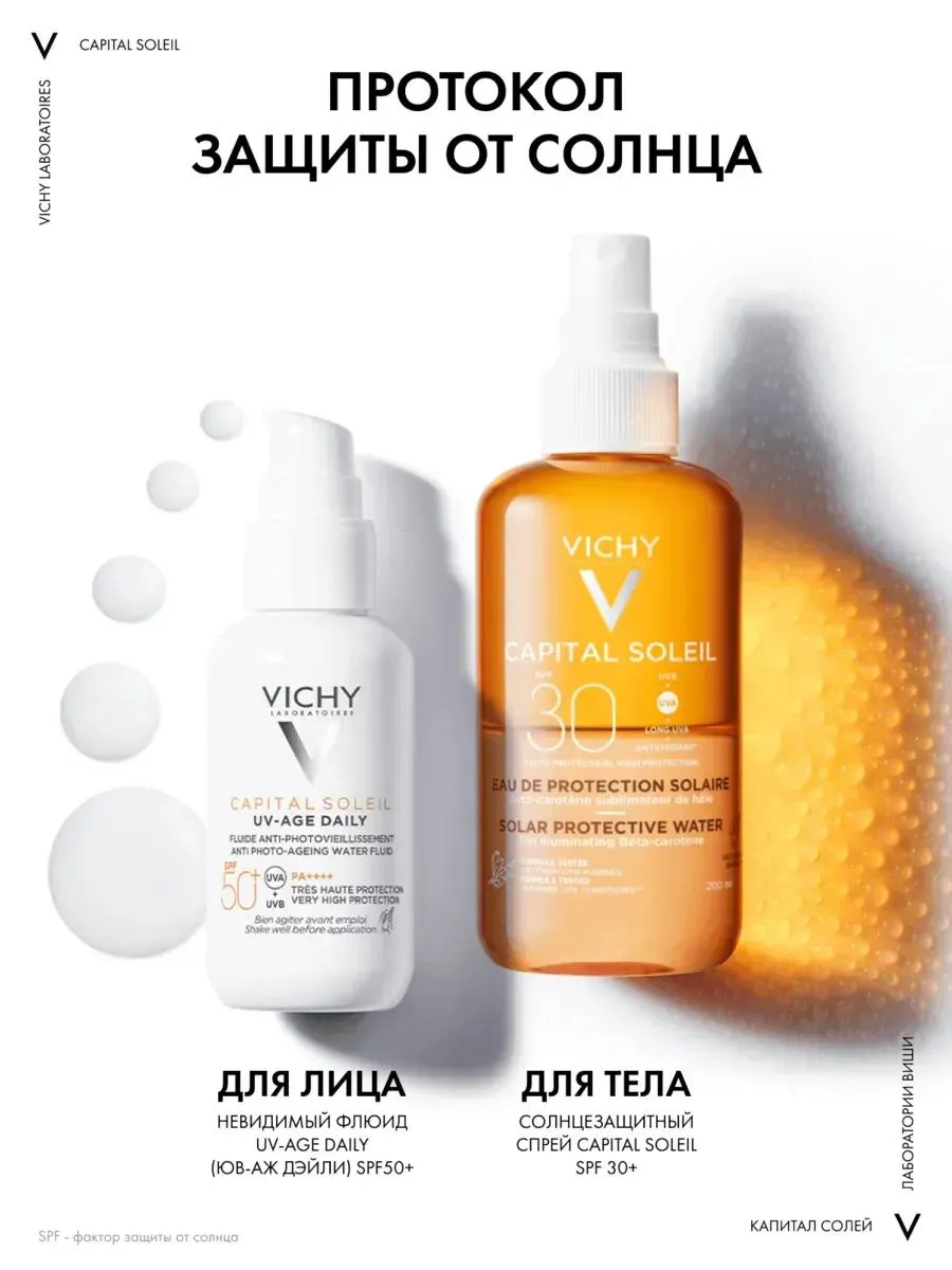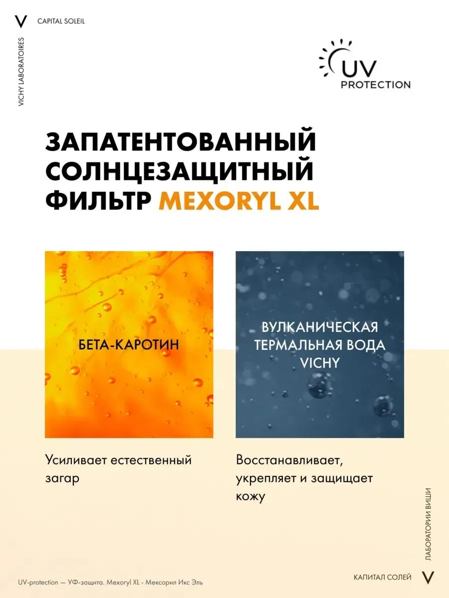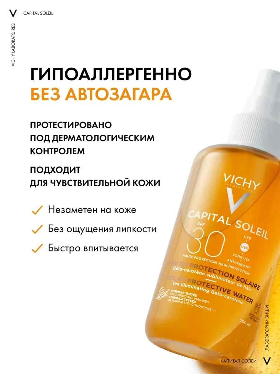 1 / 10Двухфазный спрей для загара с высокой защитой UVB + UVA. Формула с бета-каротином и минерализирующей термальной водой Vichy способствует равномерному натуральному загару и оставляет легкий сатиновый финиш.