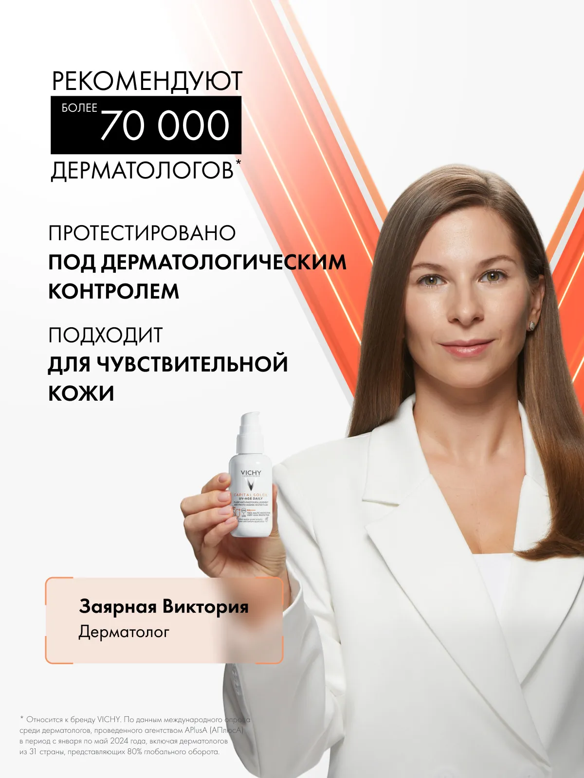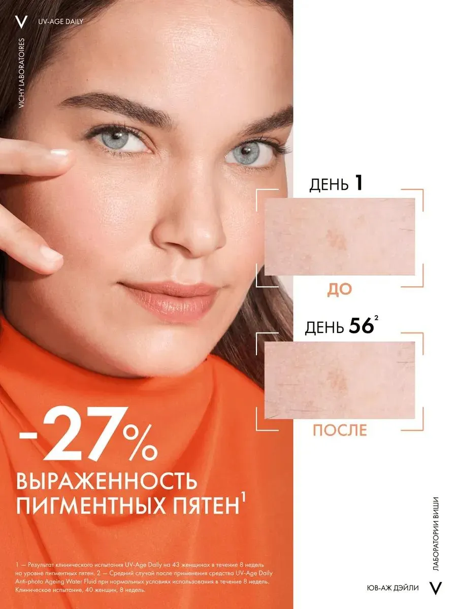 1 / 10Флюид для лица с SPF 50+, защищает от фотостарения кожи, содержит вулканическую термальную воду Vichy, пробиотическую фракцию, пептид и ниацинамид.