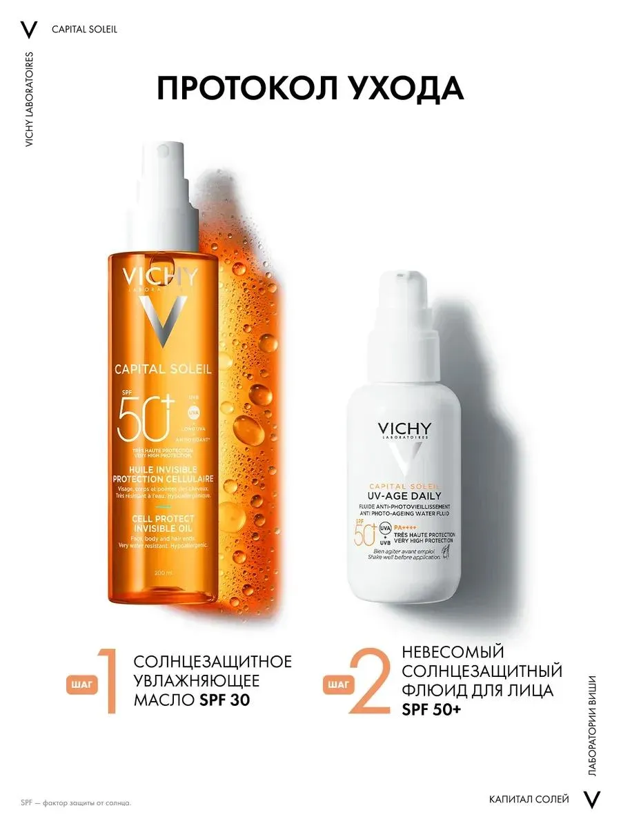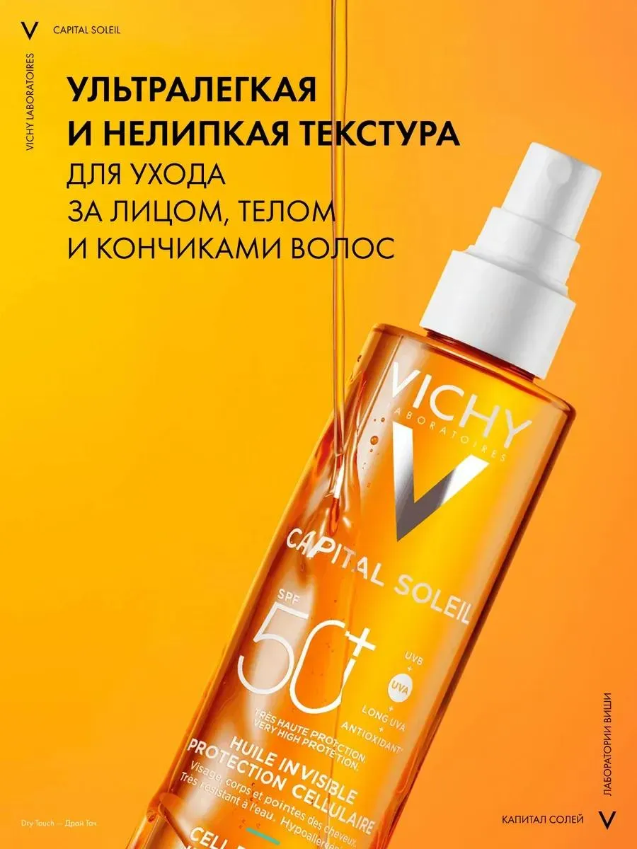 1 / 10Солнцезащитное масло VICHY CAPITAL SOLEIL CELL PROTECT подходит для лица, тела и кончиков волос. Обладает очень высокой степенью защиты от UVA-, UVB-лучей и длинных UVA-лучей. Содержит антиоксидант для защиты клеток кожи. Помогает предотвратить шелушение после воздействия солнца. Уменьшает сухость, ощущение стянутости, устраняет тусклый цвет лица.