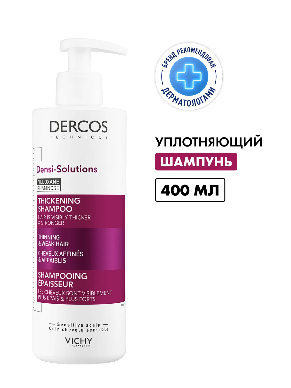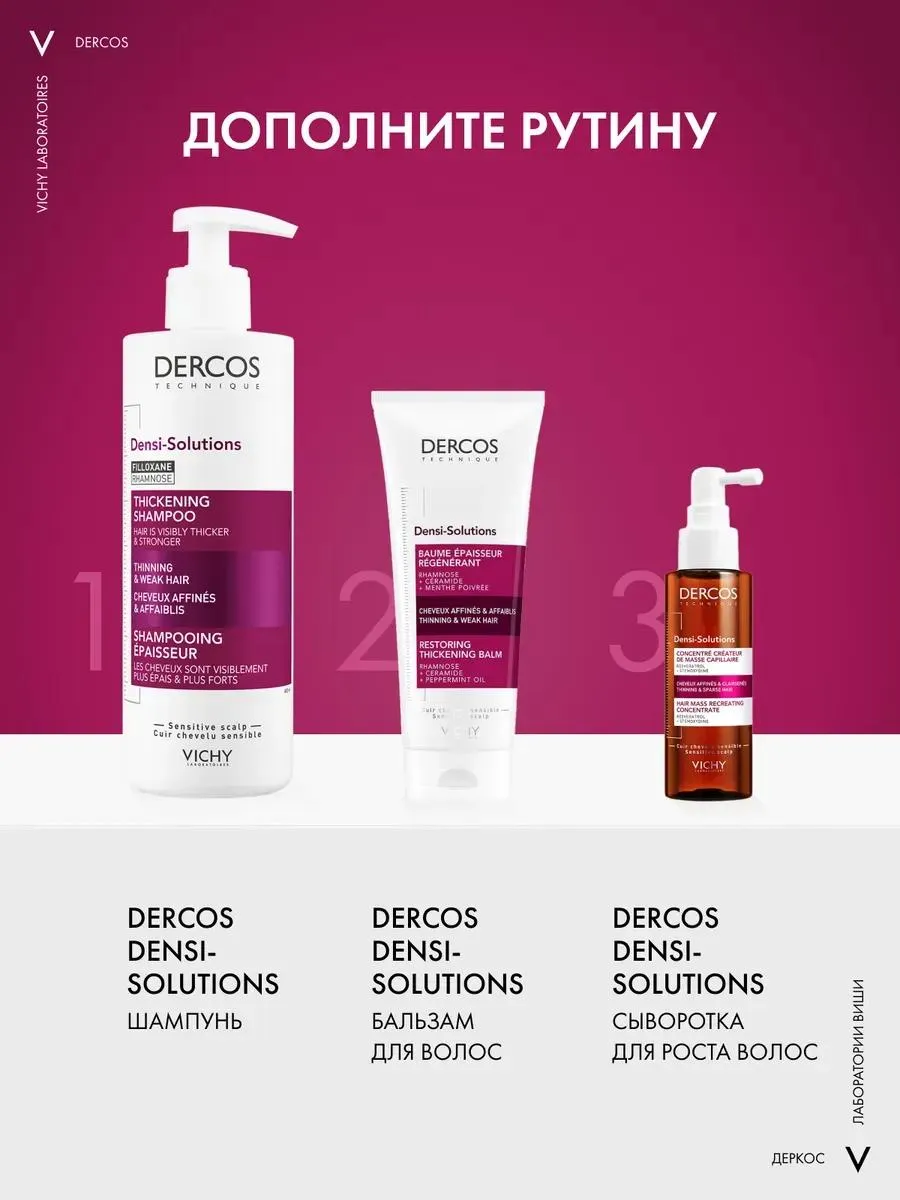 1 / 10DENSI-SOLUTIONS - это инновационная гамма средств по уходу за волосами, которая комплексно борется со всеми аспектами проблемы истончения волос. Уплотняющий шампунь увеличивает массу волос - укрепляет и уплотняет волокно волоса с каждым применением, придавая волосам объем и здоровый вид. После первого применения +40% объема при использовании только шампуня. Через 2 недели. 80% людей отметили значительное увеличение густоты волос при использовании сыворотки, шампуня и бальзама. Через 6 недель 96% - волосы заметно более плотные. 91% - волосы выглядят объемными. 95% - волосы заметно более сильные.