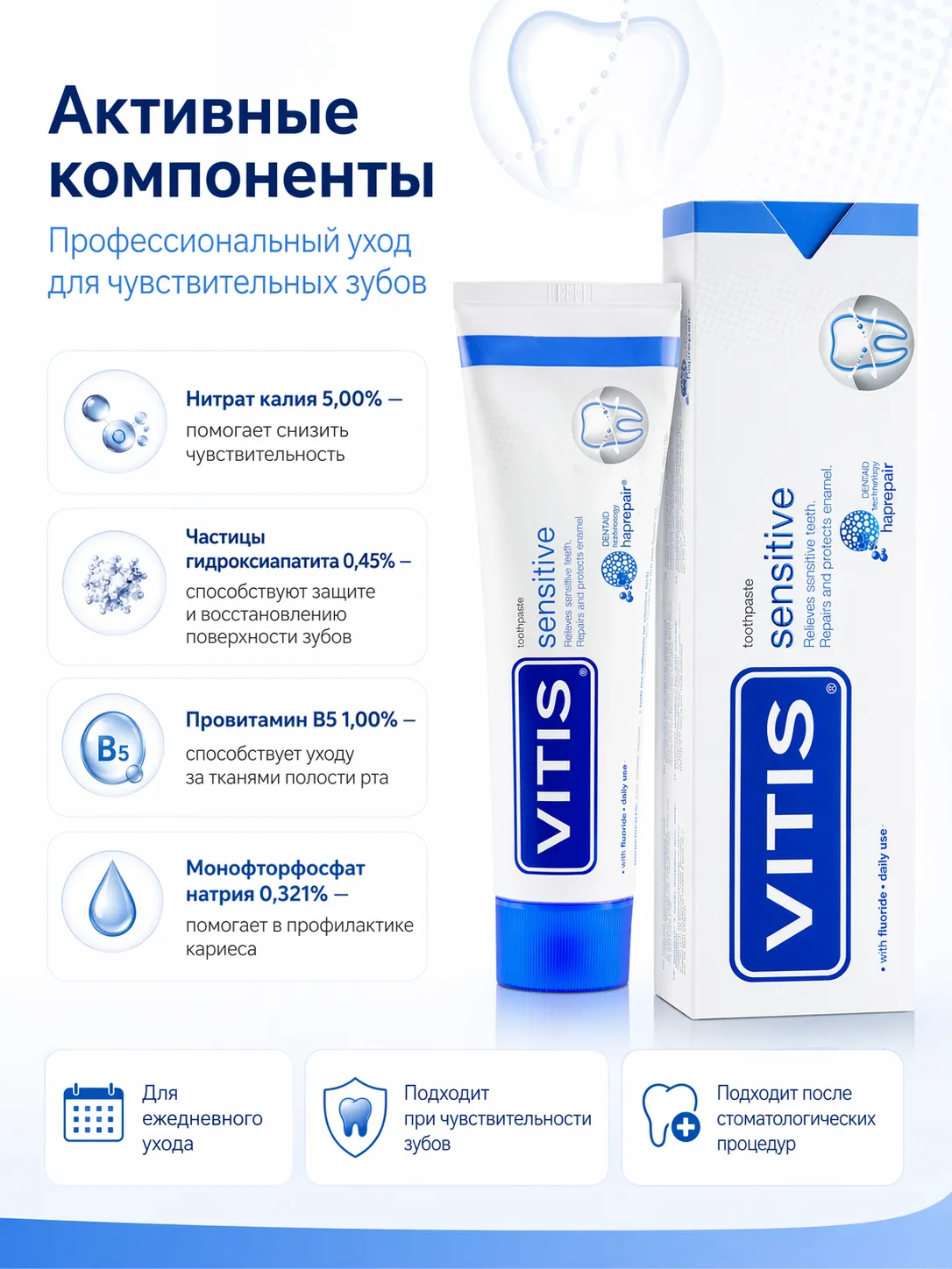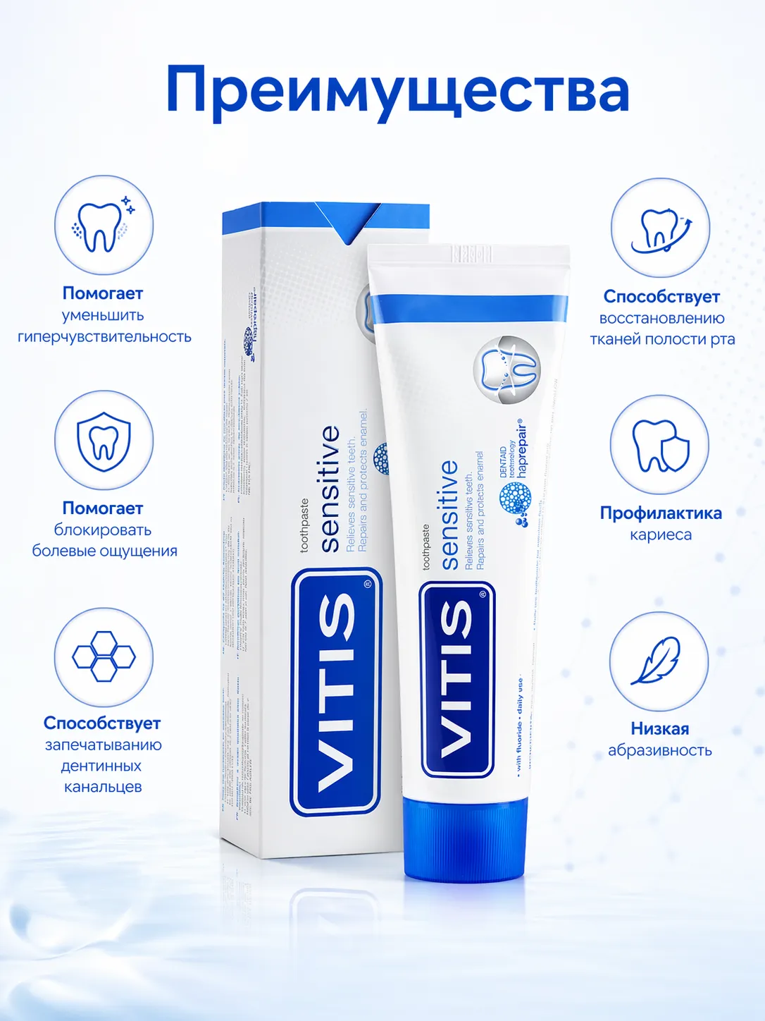 1 / 3Зубная паста Sensitive помогает уменьшить чувствительность зубов, поддерживает здоровье полости рта и профилактику кариеса благодаря фтору и активным компонентам.