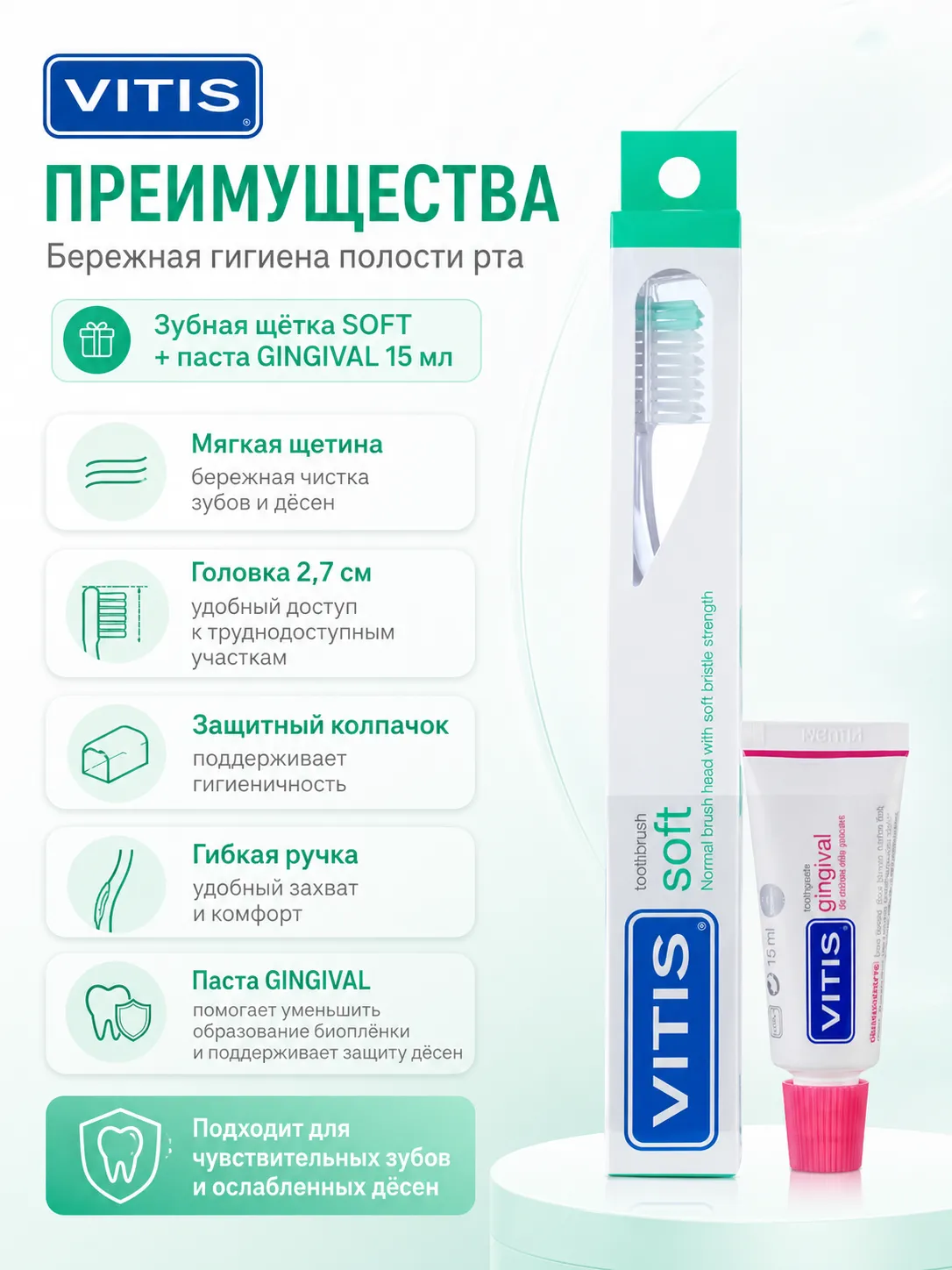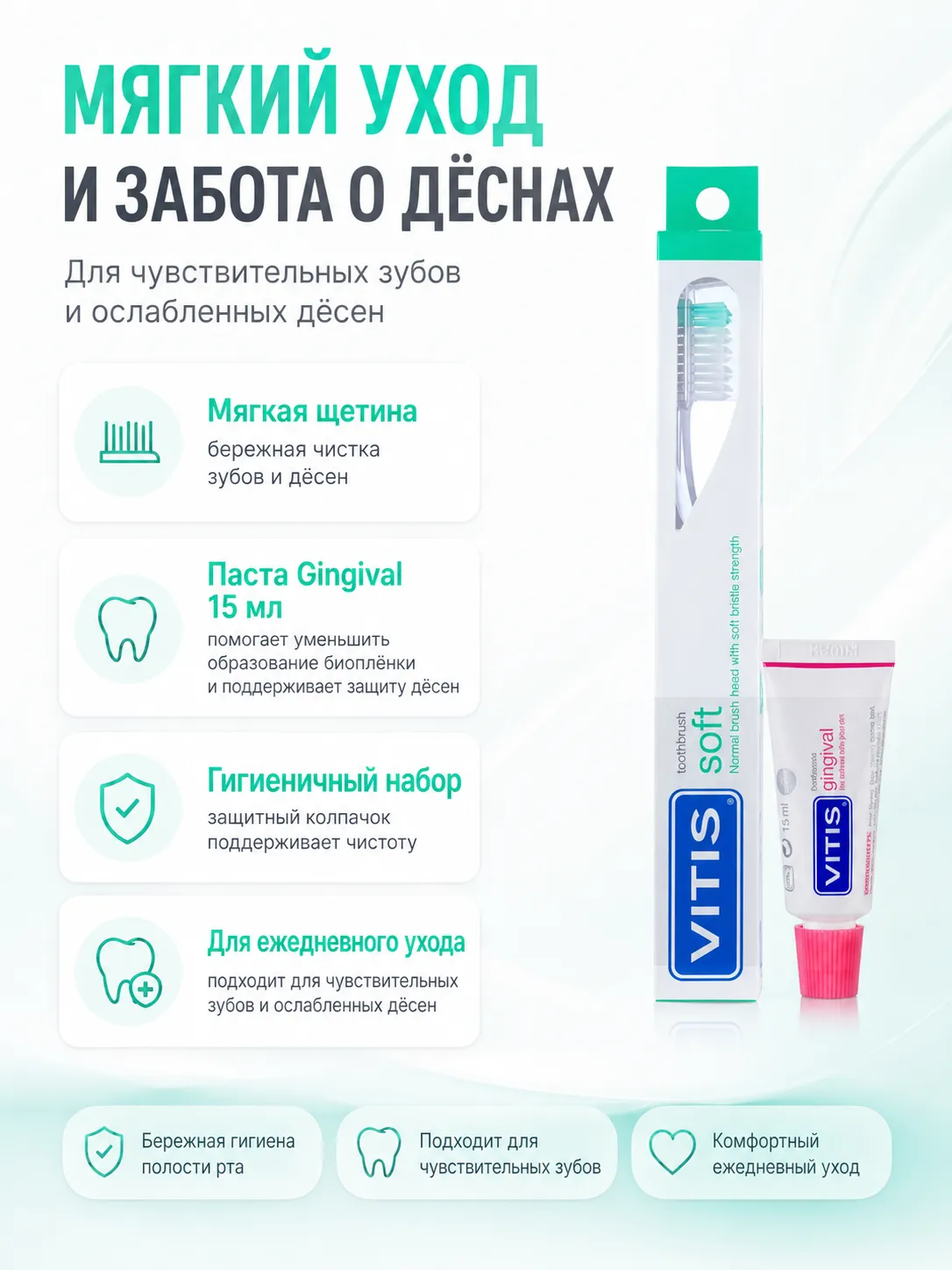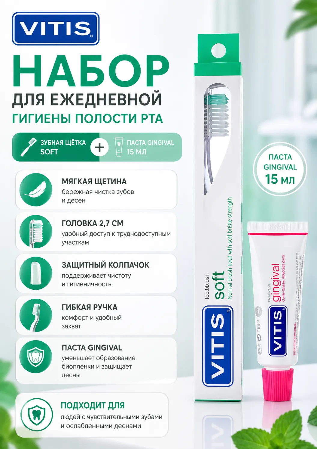 Комплект из мягкой зубной щетки VITIS и зубной пасты объемом 15 мл. Идеально подходит для бережного ухода за зубами и деснами.