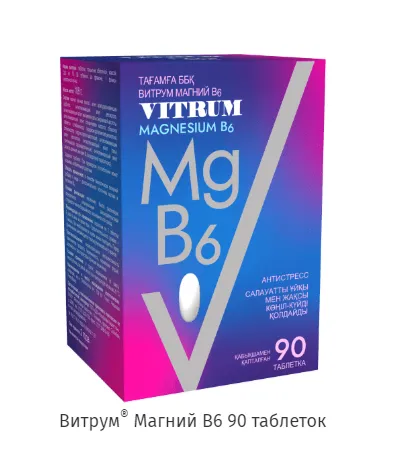 Биологически активная добавка к пище Витрум Магний В6 в форме таблеток, содержащих магний и витамин B6. Упаковка содержит 90 таблеток.
