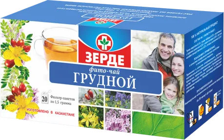 Фито-чай Грудной от Зерде содержит травы зверобоя, чабреца, девясила, солодки, шалфея и плоды шиповника. Применяется для поддержки дыхательной системы.